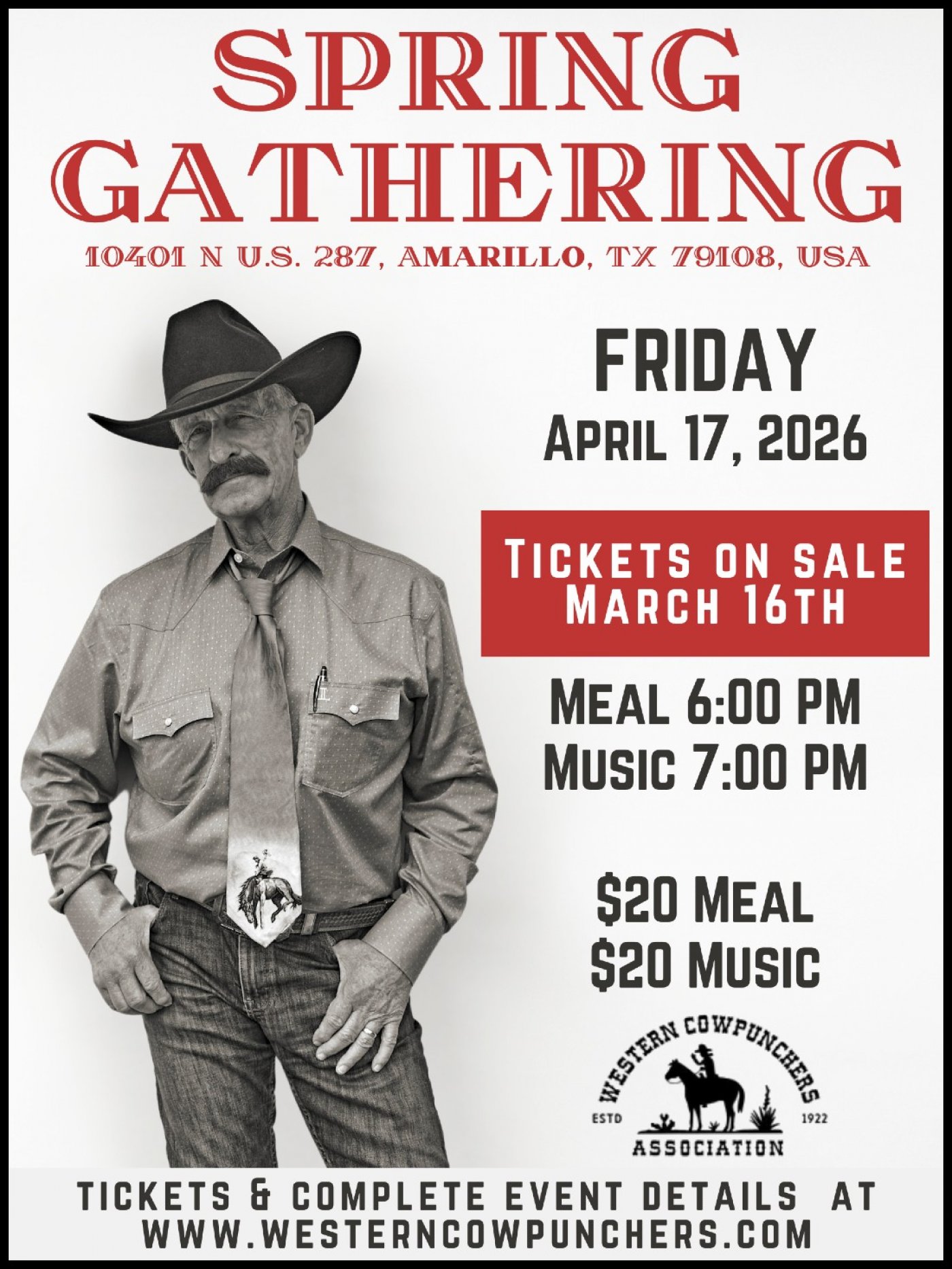 Amarillo resident RW Hampton, one of the leading Western Entertainers in America today, will be appearing Friday, April 17 at 7:00 p.m. at the Western Cowpunchers Association "Spring Gathering." (Dinner begins at 6:00 p.m. Tickets are available at www.westerncowpunchers.com. The meal is $20 and music is $20. Tickets are on sale on Monday, March 16)