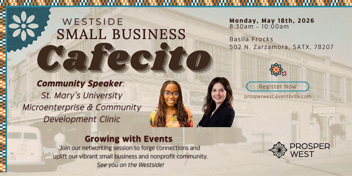 Info: Each month, we feature a guest speaker from diverse backgrounds and organizations who share valuable information on resources, services, programs, and personal stories that can benefit our community. This month's Cafecito we will introduce the opening of Prosper West headquarters at Basila Frocks, a long-awaited project in the Westside with historical significance to this San Antonio.