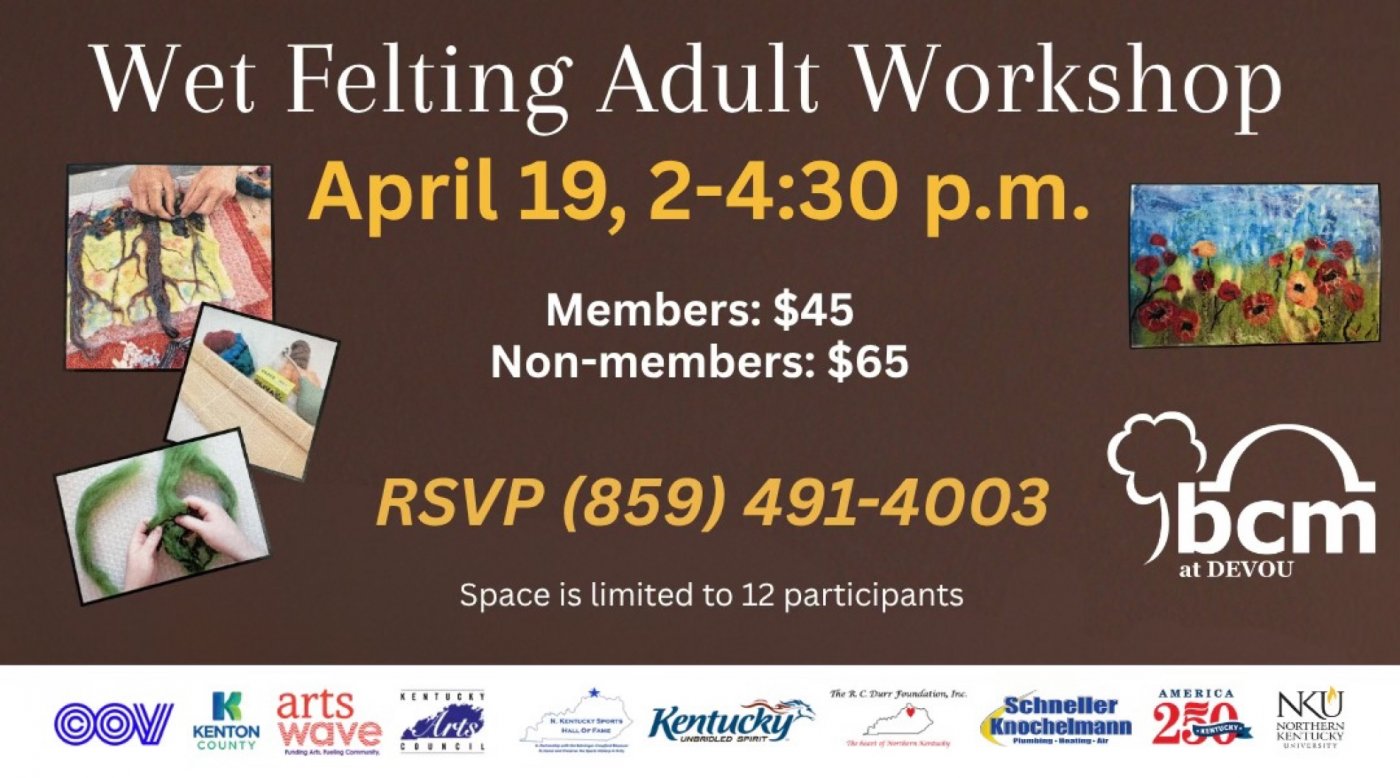 Join us for a creative afternoon learning how to transform wool, water and simple tools into a beautiful felted landscape. Guided by BCM Education Director Kim Gehring-Cook, participants will receive step-by-step instruction while creating their own approximately 9" x 9" wool-felted piece.
