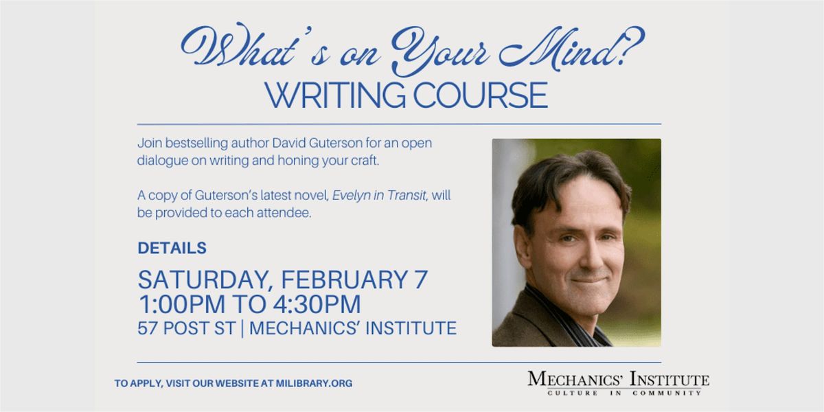 Join bestselling author David Guterson for an open dialogue on writing and honing your craft. David will begin the class with a Q&A session to determine which fiction writing topics are most interesting to the attendees - whatever is on their minds, whatever is most pressing and urgent, whatever it is they hoped for when they signed up. These topics will be discussed and explored, and David will then introduce further considerations, among them titles, opening lines, opening chapters visualizing characters, understatement, time, psychic distance, noticing, distillation, reading yourself, and the relationship between mood and syntax.