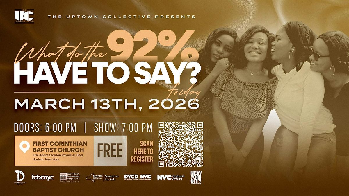 What Do The 92% Have To Say? is an intimate, living-room-style night of Black women’s truth told through story, song, dance, and embodied witness. Think: a warm room, a shared breath, and art that feels like sitting with the ancestors and aunties, letting wisdom land close. Come ready to be moved, affirmed, and reminded that our voices carry memory and power.