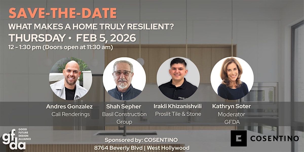 Join us at Cosentino in West Hollywood for a lunchtime panel discussion on What Makes a Home Truly Resilient? Industry professionals will provide practical insights on material performance, design strategies, and practical applications for creating fire-resilient homes.