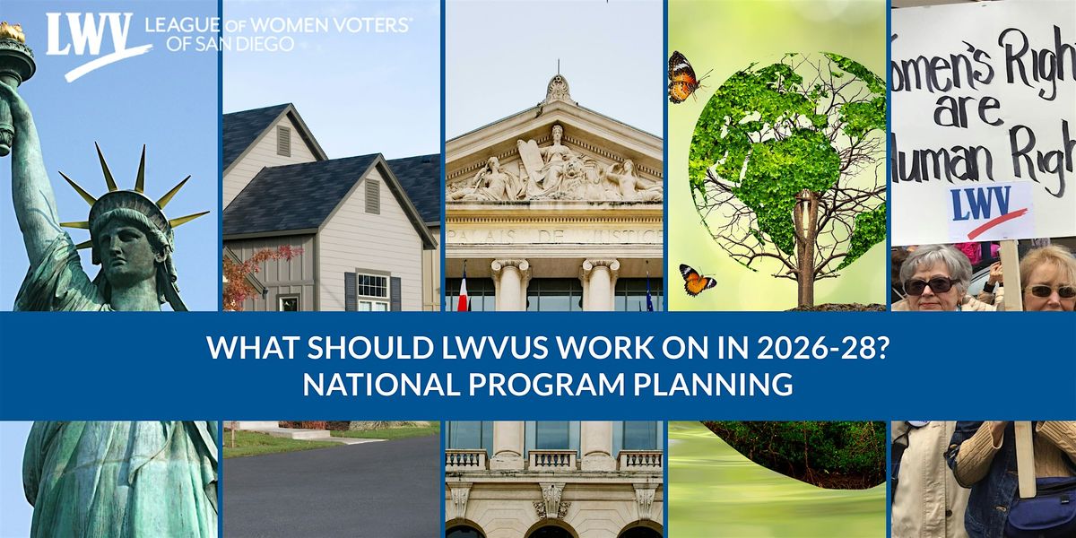 Join LWVSD members for discussion about the critical issues facing our democracy in the years ahead and what LWVUS, the National League, should be working on. Our ideas will be forwarded to the National League for consideration before the National Convention in June 2026 in Columbus, Ohio.