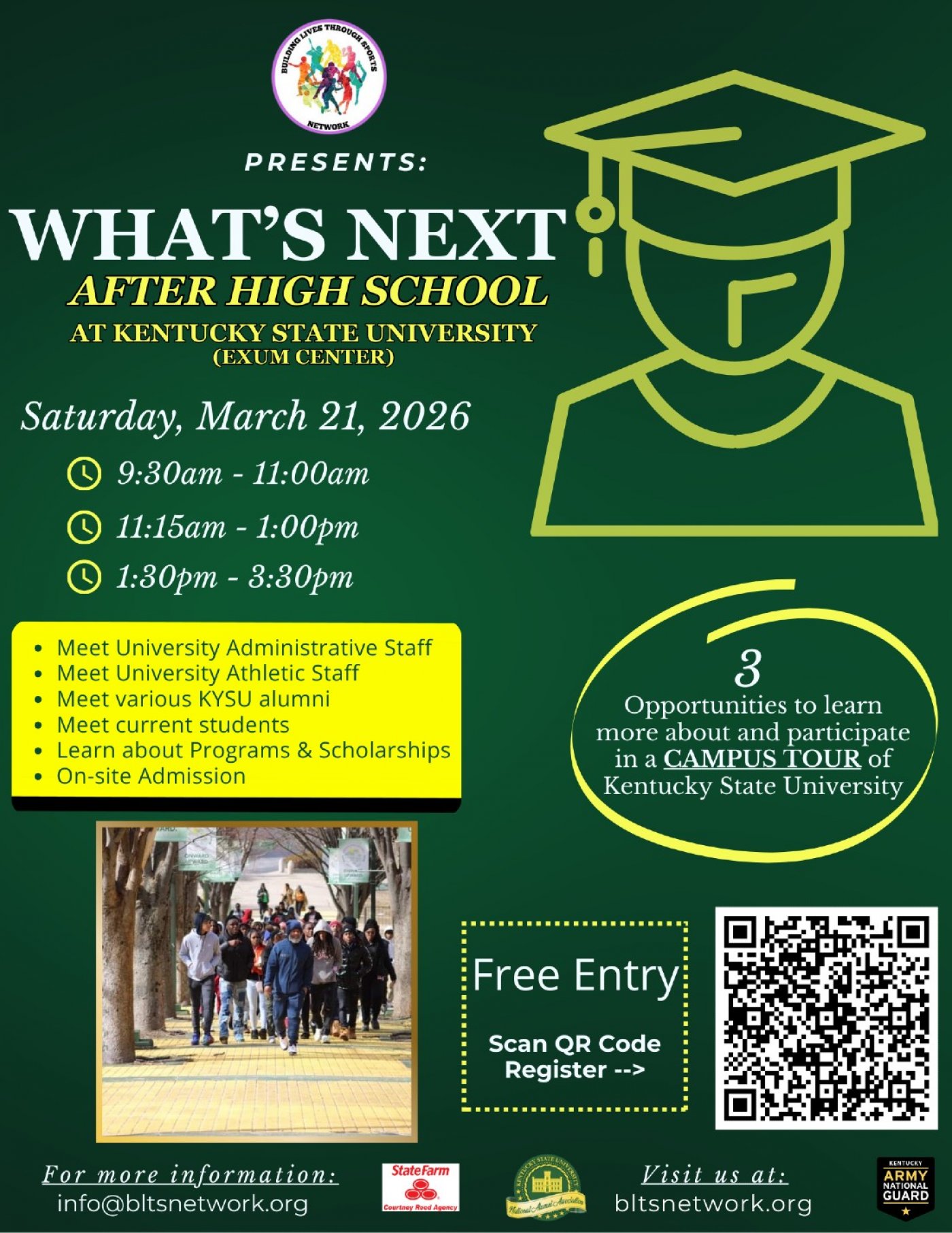 This event is structured to provide a comprehensive college and career readiness experience. Information and resources will be shared with students, student-athletes and parents regarding the "What's Next After High School" journey. Participants will hear from Kentucky State University administrative staff, Kentucky State University alumni, military branches, and various community supporters.