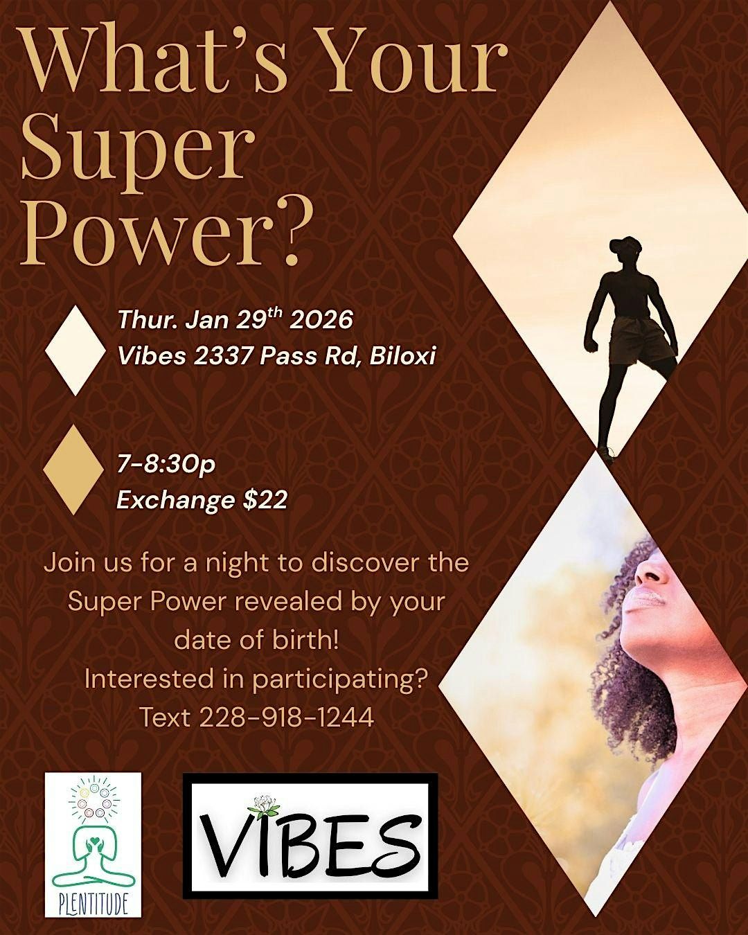 Welcome to What's Your Super Power? Join us at Vibes on January 29, 2026 at 7:00 PM to uncover your hidden superpower based on your birth date. Are you ready to tap into your unique abilities and unleash your full potential? Let's explore together in a fun and interactive setting. Don't miss out on this opportunity to discover what makes you truly extraordinary!