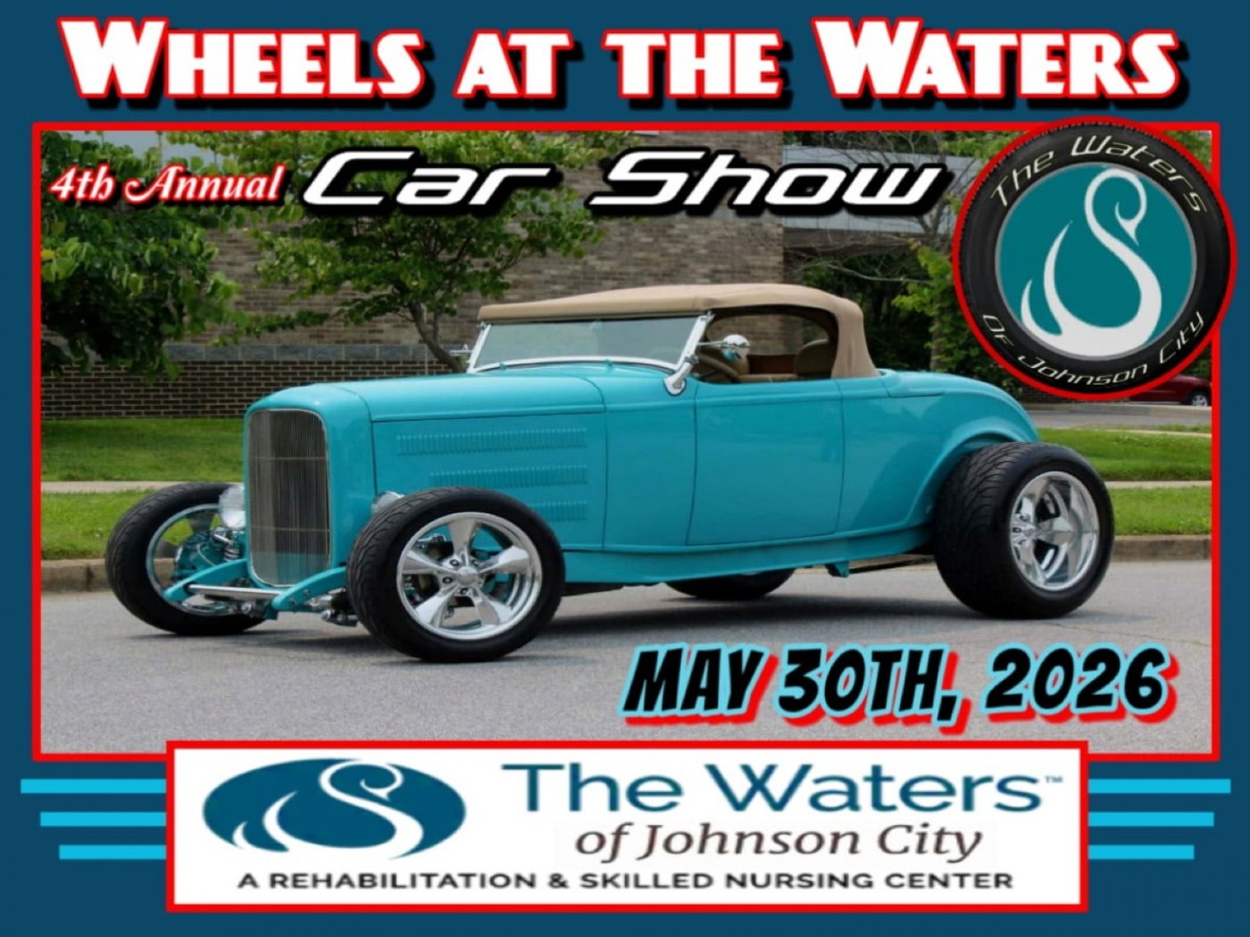 4th annual car show at the waters of Johnson City if it has wheels bring it.Dash plaques to the first 50 residents pick top25 plus best of class and best of show and door prizes we will have food trucks and live music. All proceeds go to activities for the residents