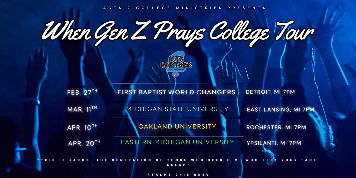 Welcome to the When Gen Z Prays College Tour happening at First Baptist World Changers on February 27, 2026, at 7:00 PM (Eastern Time)! This event is an evening where college students and Gen Z will be filled with a powerful word on prayer, strategic intercession, prophetic worship, and community. This event is a great opportunity for Gen Z to come together, connect, and grow spiritually. Come as you are and be ready to experience the Glory of God! We can't wait to see you there!