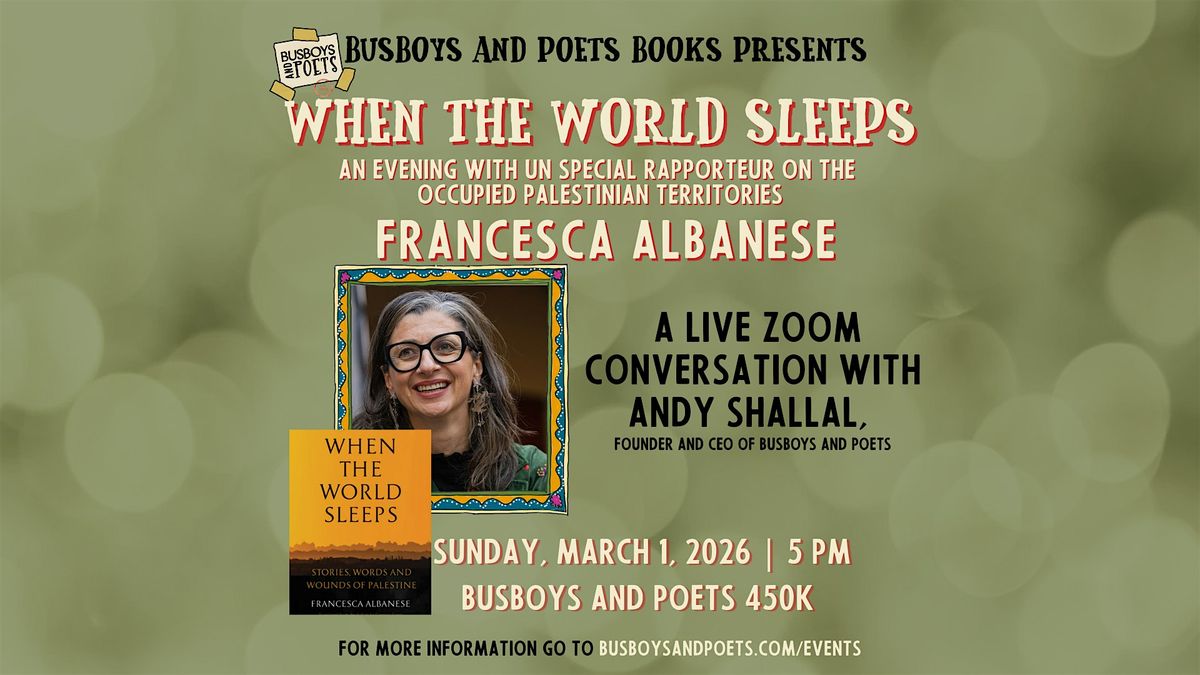 Albanese will discuss her forthcoming book, When the World Sleeps: Stories, Words, and Wounds of Palestine, releasing April 28, 2026.