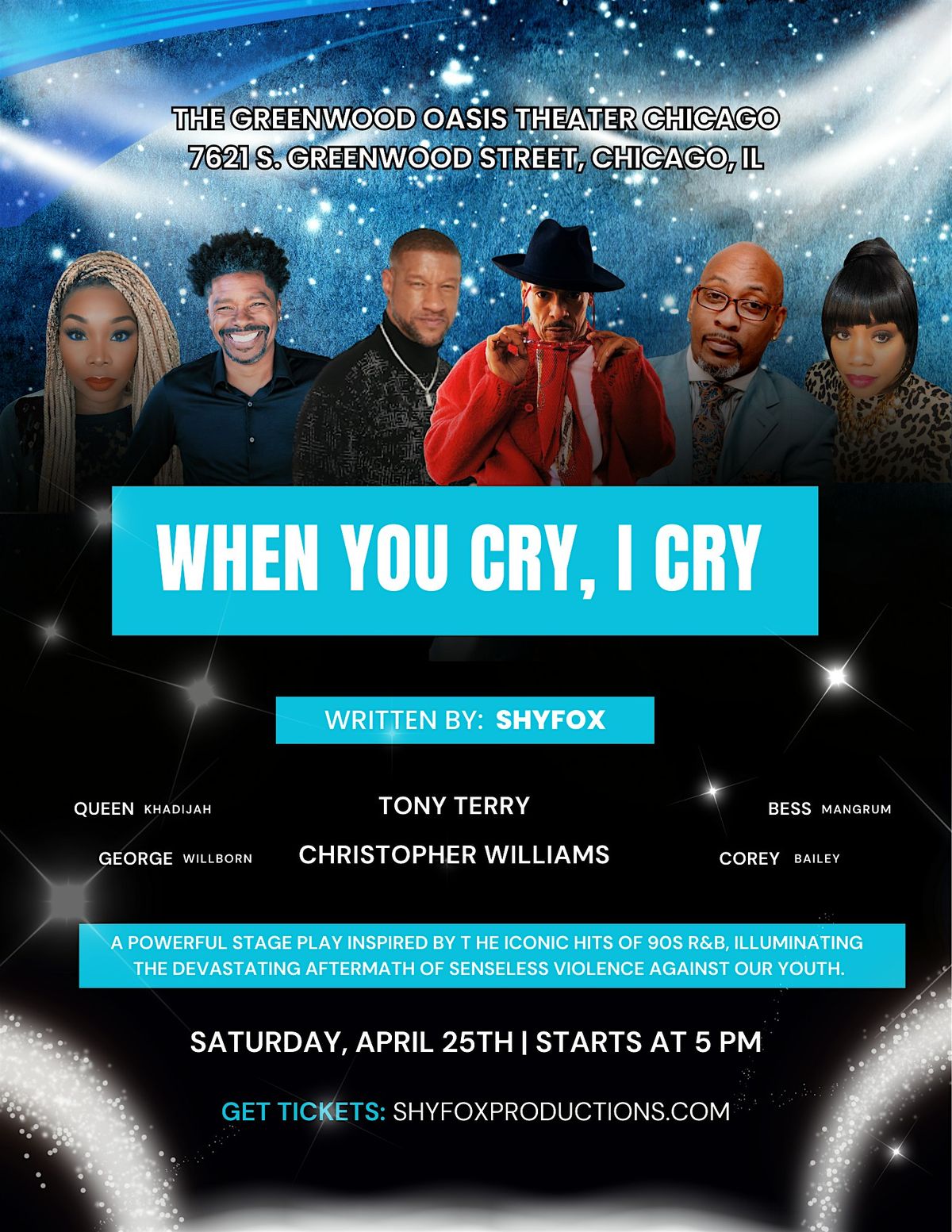 "WHEN YOU CRY, I CRY" starring Tony Terry, Christopher Williams, and George Willborn is coming to The Greenwood Oasis Theater, located at 7621 S Greenwood Ave, on April 25, 2026, at 5:00 PM (Central Time) - VIP Meet and Greet (2:00 - 3:30 p.m.).