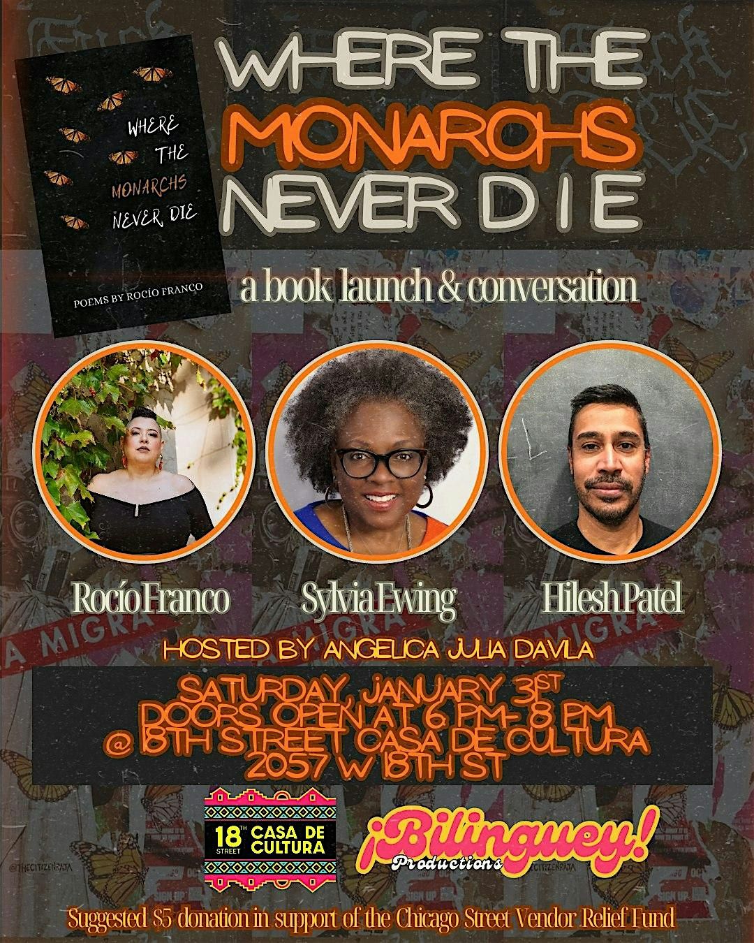 Join us in celebrating local Chicana poet Rocío Franco’s debut poetry chapbook Where the Monarchs Never Die (Arcana Poetry Press). Rocio Franco will be joined by writers Sylvia Ewing and Hilesh Patel in an evening of poetry and conversation and will be hosted by Angelica Julia Dávila