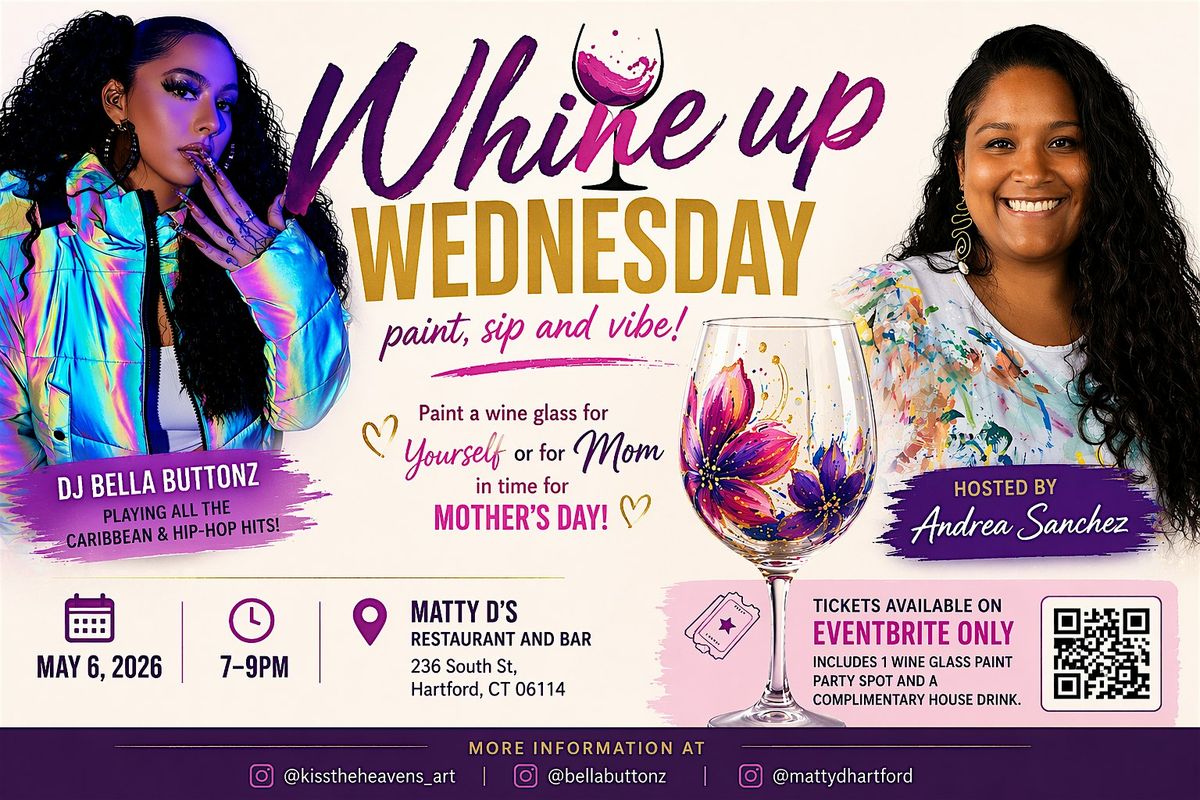 Paint, sip & vibe at Whine Up Wednesday! Create a wine glass, enjoy music by DJ Bella Buttonz & a free drink. May 6, 7–9pm