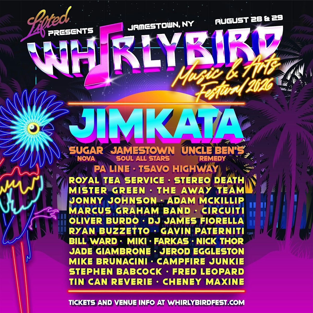 Whirlybird Music & Arts Festival 2026 returns to Downtown Jamestown August 28 & 29, presented by Lifted. For two days, downtown Jamestown gets a little louder, a little brighter, and a whole lot more fun with music, art, and community everywhere you look.
