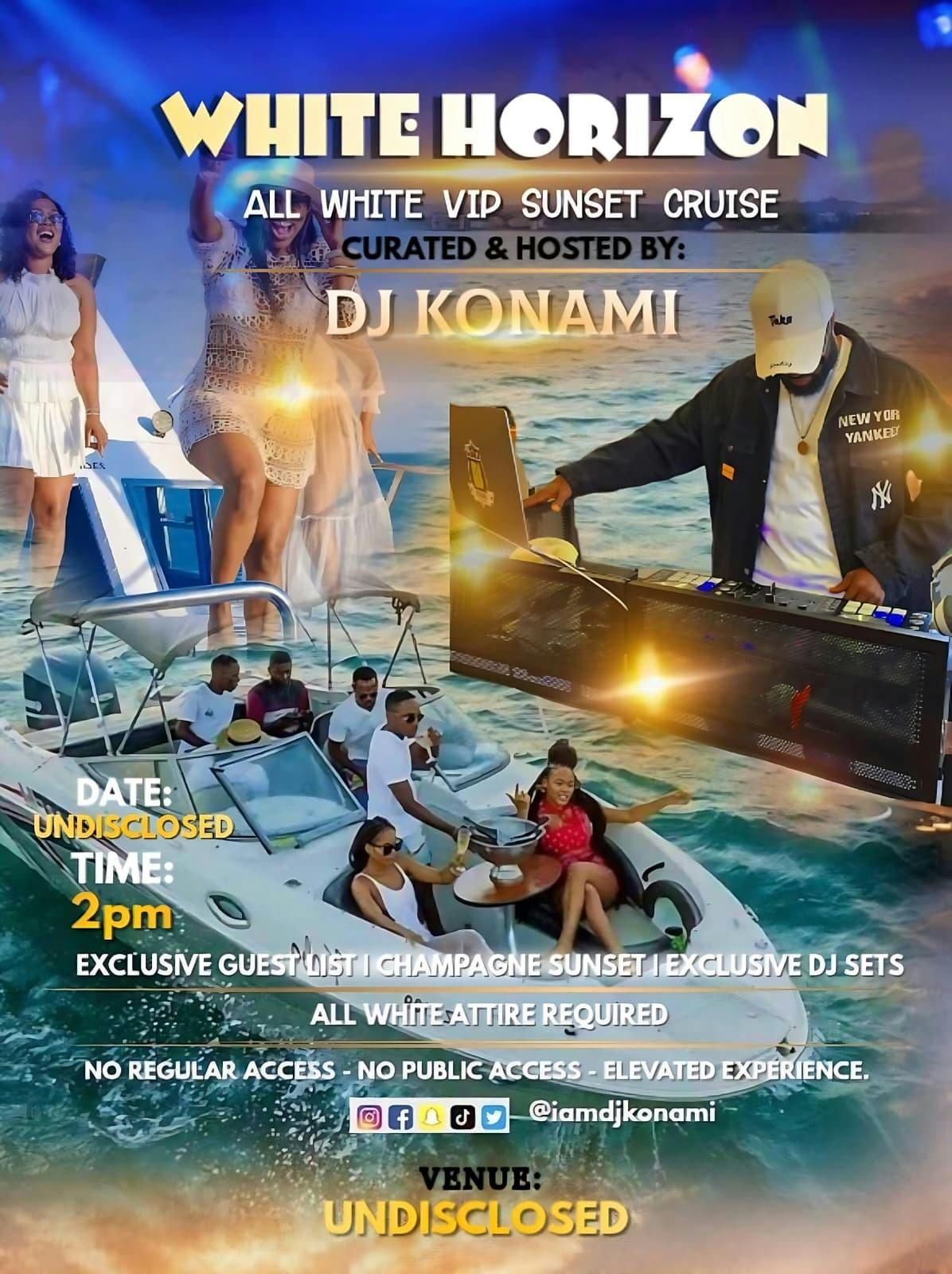 An exclusive, all-white sunset cruise curated by DJ KONAMI.This private experience brings together a select circle for an evening of elevated music, ocean views, and refined energy, as the sun dissolves into the horizon.