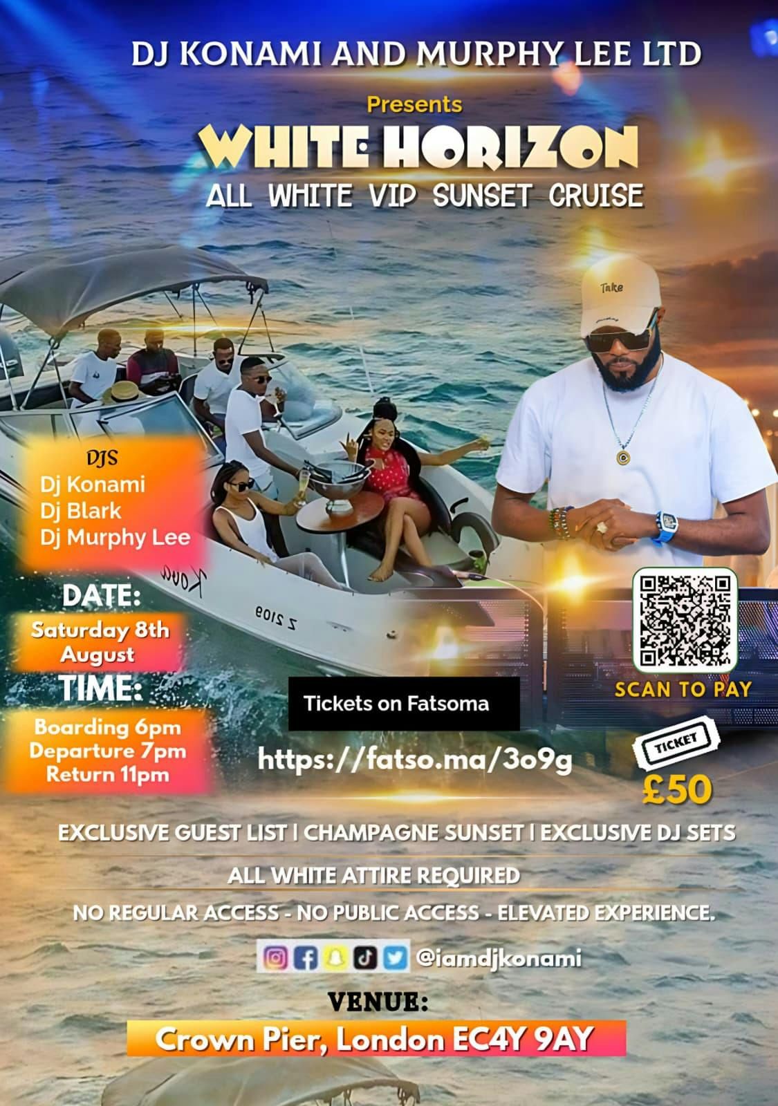 An exclusive, all-white sunset cruise curated by DJ KONAMI and MURPHY LEE LTDThis private experience brings together a select circle for an evening of elevated music, ocean views, and refined energy, as the sun dissolves into the horizon.