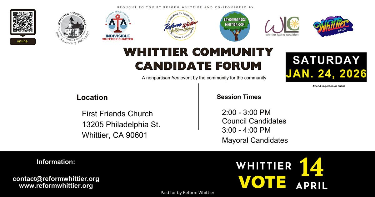 This is a nonpartisan free event for Whittier residents by Whittier residents. Questions will be solicited from attendees for candidates to answer. If you are not able to attend online, please join us via Zoom.