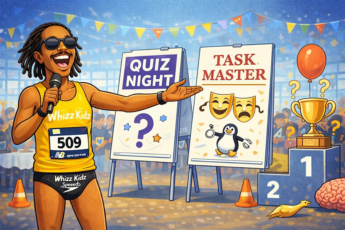 Info: Teams compete across a range of quiz rounds and games, with short breaks to refresh drinks, compare scores, and continue the steady financial encouragement process.