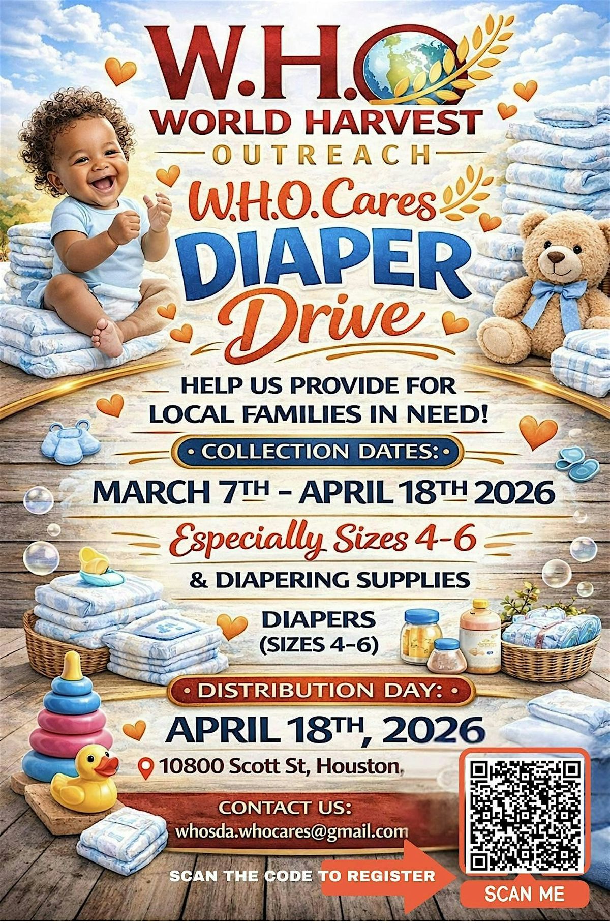 Join us in person to receive FREE DIAPERS at the W.H.O. Cares ❤️ Community Diaper Drive & Distribution! It's a fun and friendly way to support families in need by donating diapers or RECEIVE DIAPERS. Let’s come together, share some smiles, and make a real difference in our community. Everyone's welcome – bring your energy and big hearts! Don’t miss out on this awesome chance to give back and connect. To receive diapers, you must register INCLUDE SIZES NEEDED. Tickets are not required. See you there!