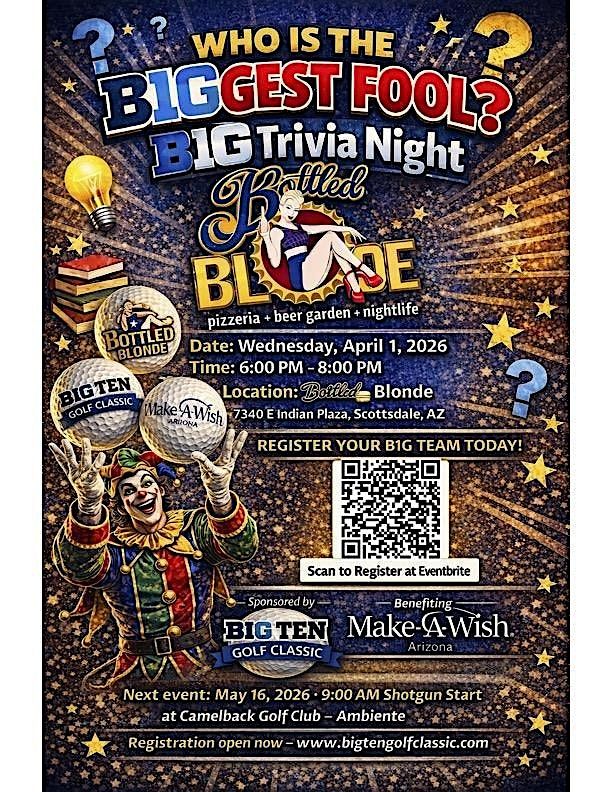 Get ready to put your Big Ten knowledge to the test at Who's the Biggest Fool--Big Ten Trivia Night! Join us in person for a fun-filled evening of friendly competition, laughs, and bragging rights. Whether you’re a die-hard fan or just love trivia, this night’s all about having a blast with fellow fans. Bring your A-game, some friends, and let’s see who’s the biggest fool (or the biggest brain) of them all!