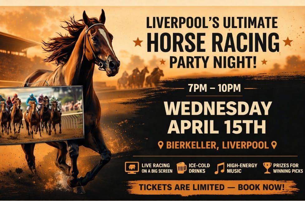🏇✨ Liverpool’s Ultimate Horse Racing Party Night! ✨🏇Get ready for an electrifying evening of style, speed, and celebration at the iconic Bierkeller Liverpool!