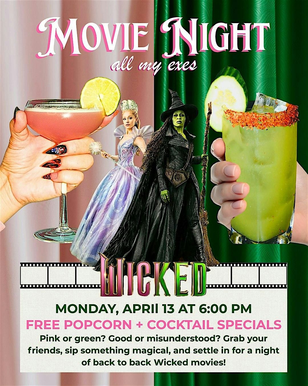 Enjoy a double feature of both Wicked films on the big screen at All My Exes. Admission is free, but you'll want to reserve the best spots for your viewing experience. We'll also be providing complimentary movie theater popcorn, and we have created two INCREDIBLE drink specials (the Elphaba and the Galinda) that are available for one night only! What's more --- fill out a Wicked trivia sheet for your chance to get all of your drinks taken care of by us! You won't want to miss this magical night!