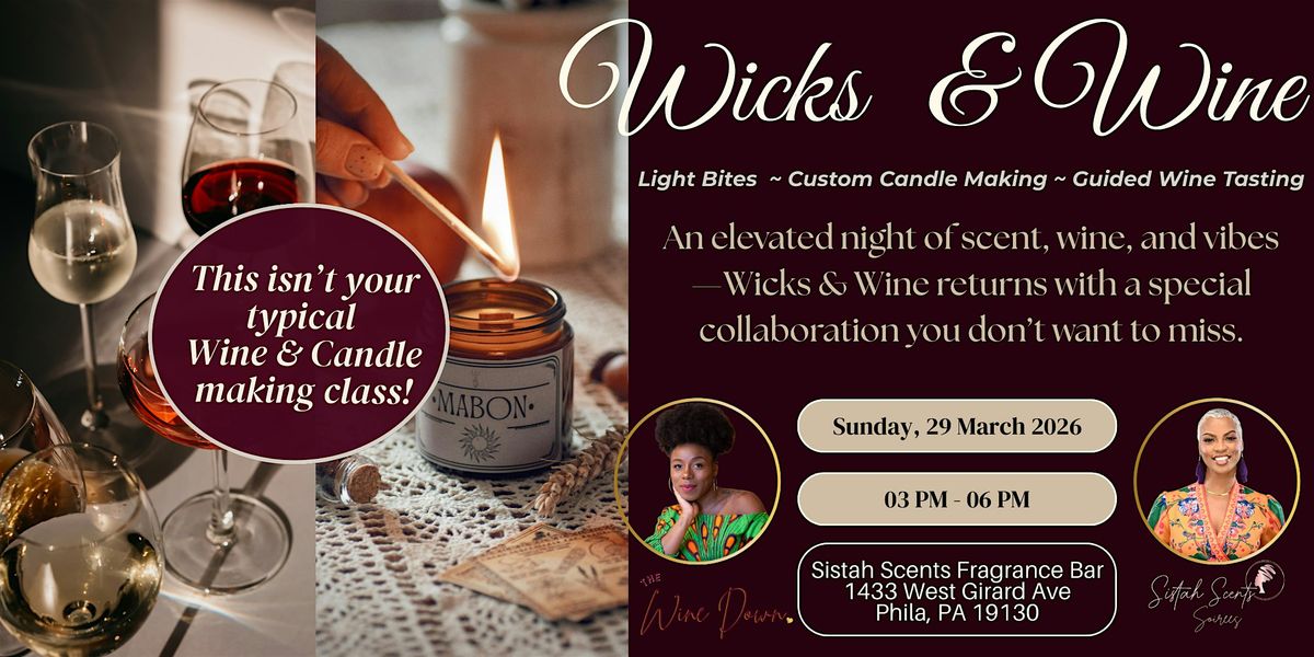 Join Sistah Scents for an immersive evening where creativity meets culture. Guests will be guided through creating a custom soy candle, then transition into a curated wine tasting led by Chanelle Wilson of Wine Down PHL, a rising Black woman sommelier known for making wine approachable and fun.