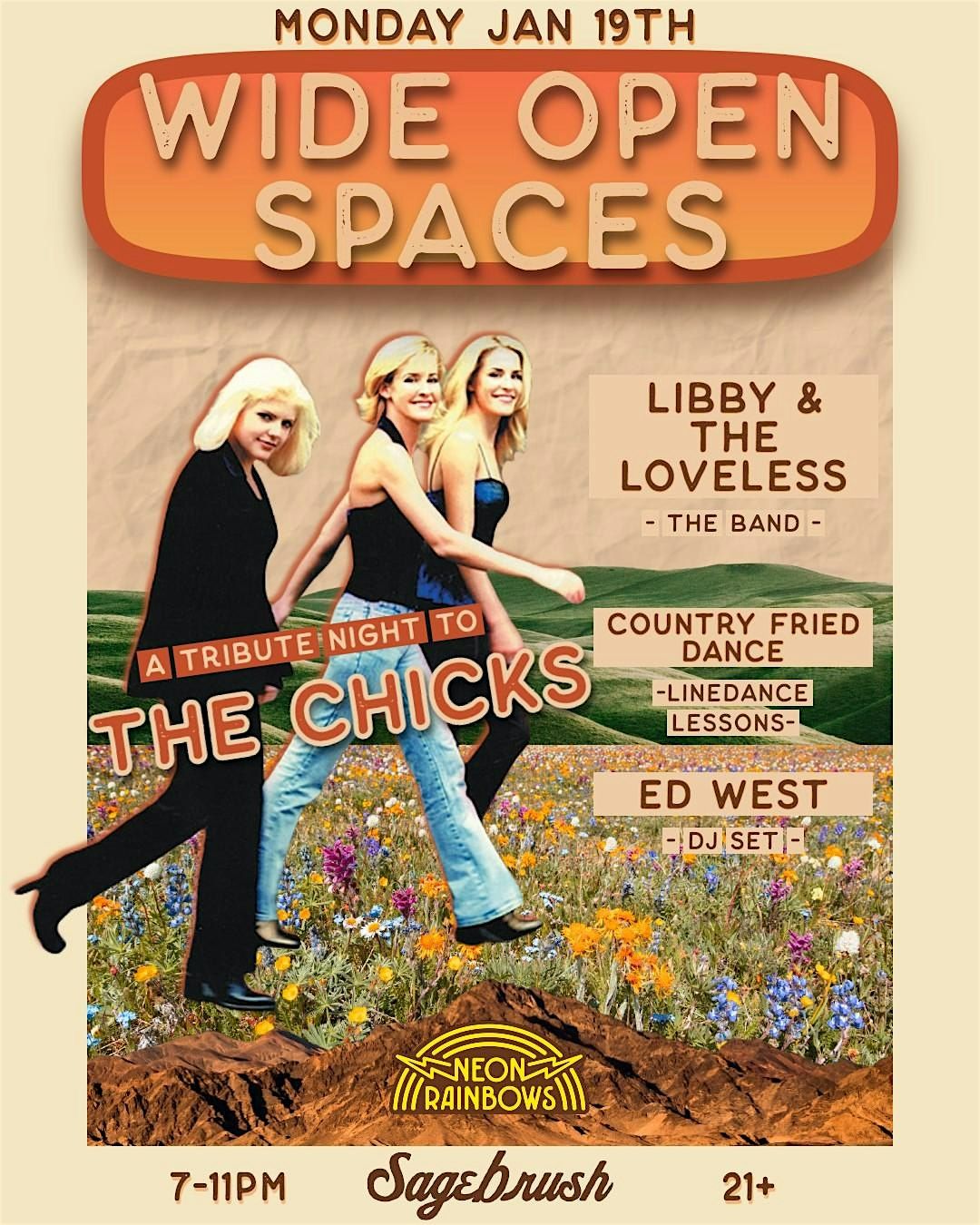Join us MONDAY JANUARY 19TH at the Sagebrush Honky-Tonk for a celebration of the 28th Anniversary of the Chicks iconic album, Wide Open Spaces. Live bands will be covering tunes by the Chicks! Tonight the heartache is on us!