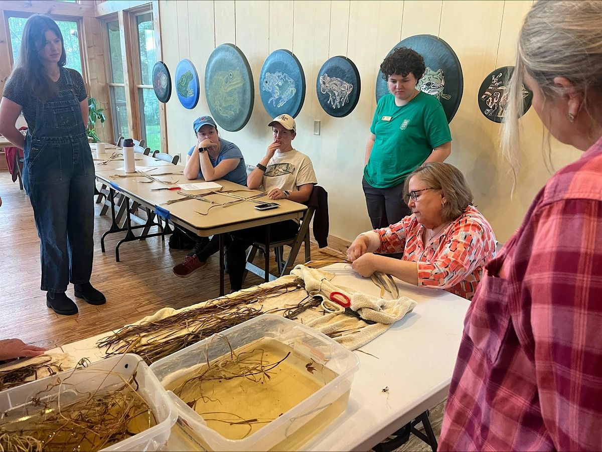 Join us for a hands-on basket weaving workshop, creating a small round basket from nature’s storehouse. Learn about weaving techniques such as over-under weave, spokes, twining, and rims. We will explore weaving materials from nature such as daffodil leaves and stems, cattail, iris, sweetgrass, morning glory, day lilies, and others. All materials will be provided. No weaving experience is required.