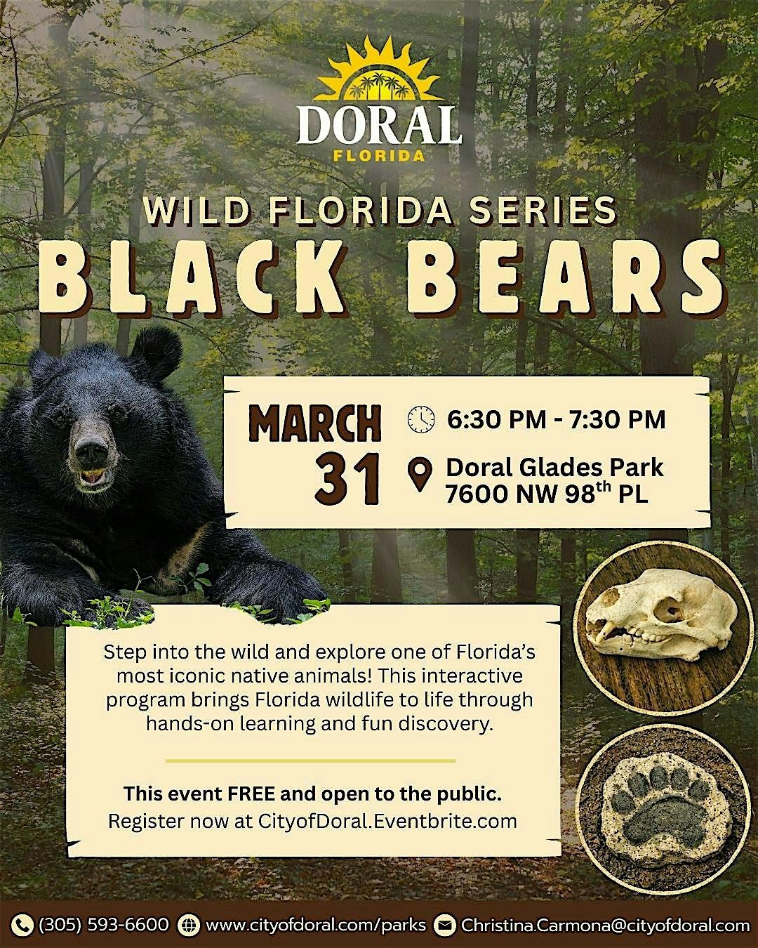 Discover the fascinating world of Florida’s largest land mammal during this educational seminar exploring these powerful yet often misunderstood animals. Learn about their behavior, diet, seasonal movements, and the habitats they depend on to survive. Get a closer look at bear skulls, tracks, and other biofacts as we examine how bears grow, communicate, and navigate the landscape around us — and what to do if you encounter one in the wild.
