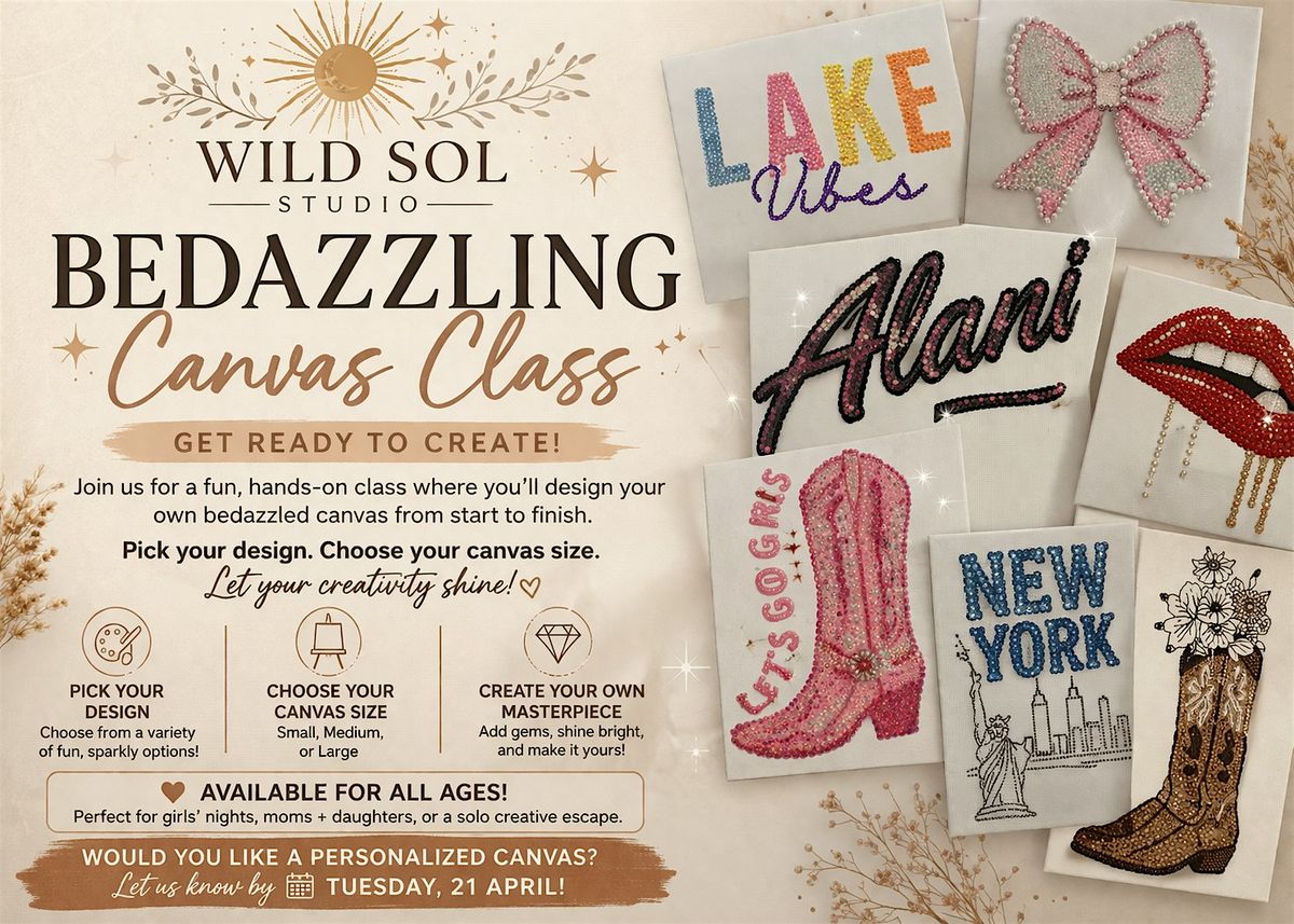 Get ready to unleash your creativity in our in-person Wild Sol Bedazzling Canvas Class! This fun and casual event is perfect for anyone who loves to add a little sparkle to their art. Whether you're a beginner or a pro, you’ll enjoy painting and bedazzling your very own canvas masterpiece. Hang out, mingle, and let your imagination run wild with colors and bling. Don’t miss out—come make something awesome!