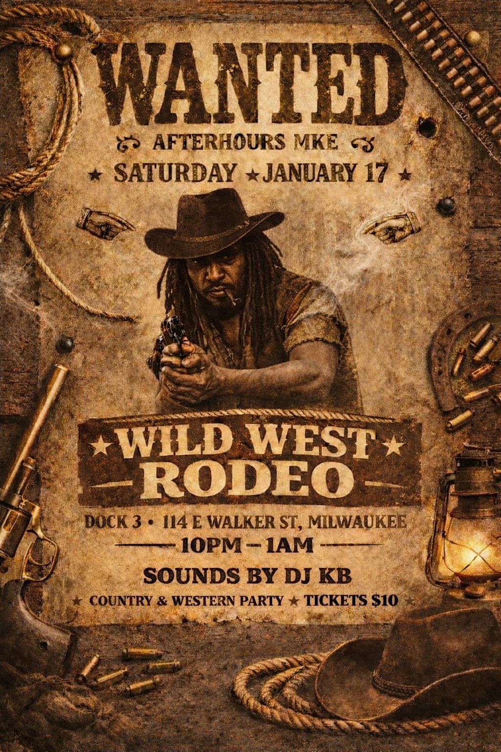A Wild West–themed party at Dock 3, sounds by DJ KB! Doors open at 10pm, Tickets $10.