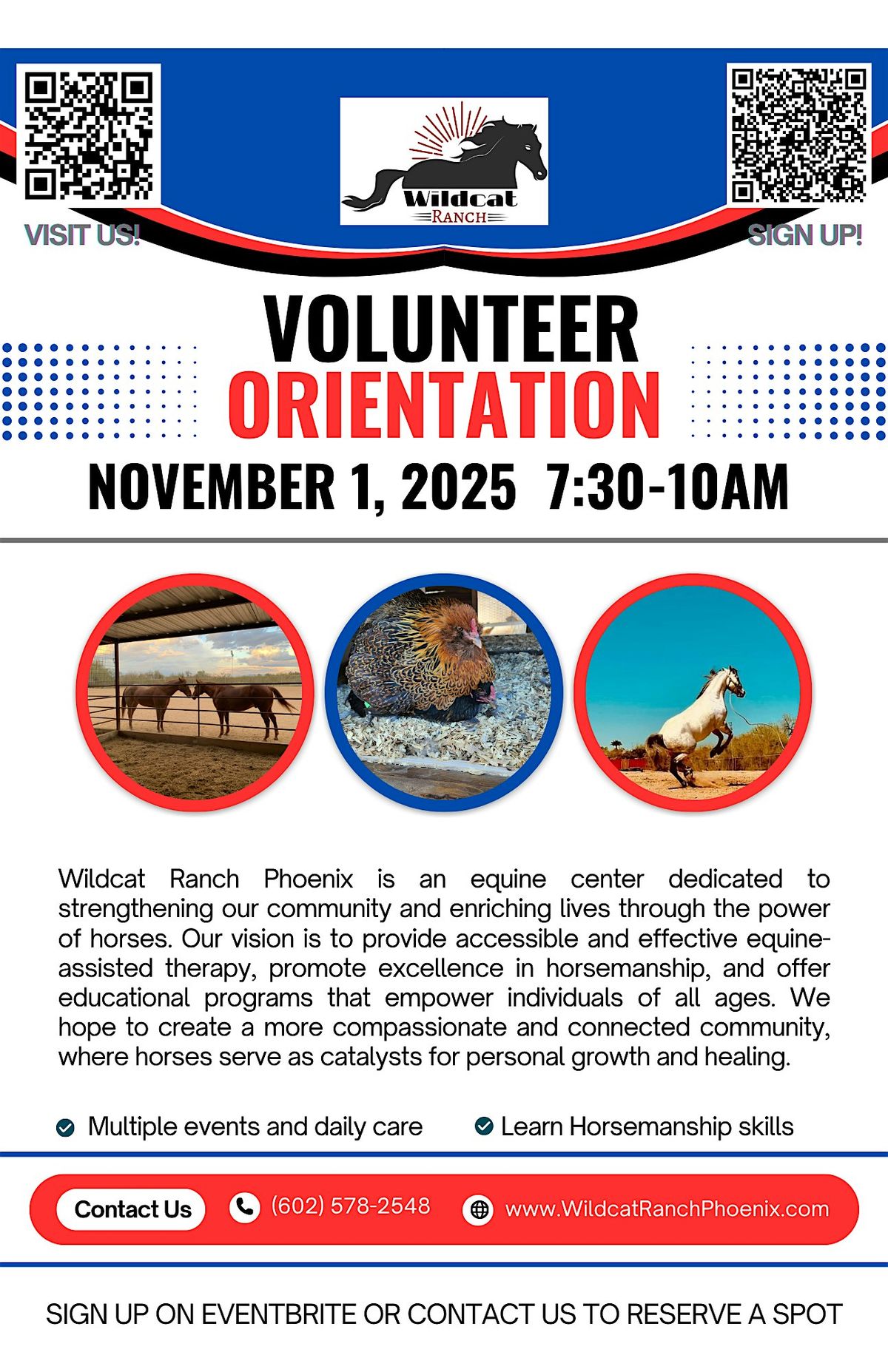 Come join us at Wildcat Ranch for an exciting and informative volunteer orientation session. This in-person event is your chance to learn about our mission, meet fellow volunteers, and get a sneak peek at the ranch's activities. Whether you're a seasoned volunteer or new to the team, this orientation is a great opportunity to get involved and make a difference.