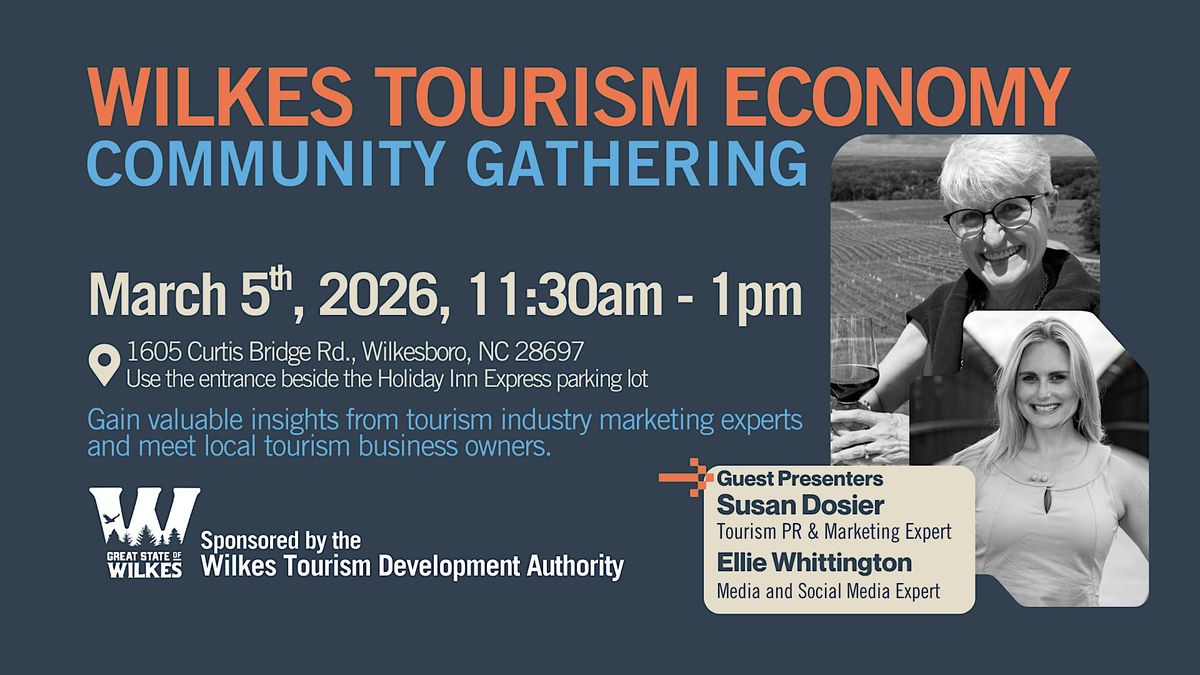 Info: Bring a friend from the Wilkes Tourism Economy (not from your own business) to be entered for some phenomenal door prizes!