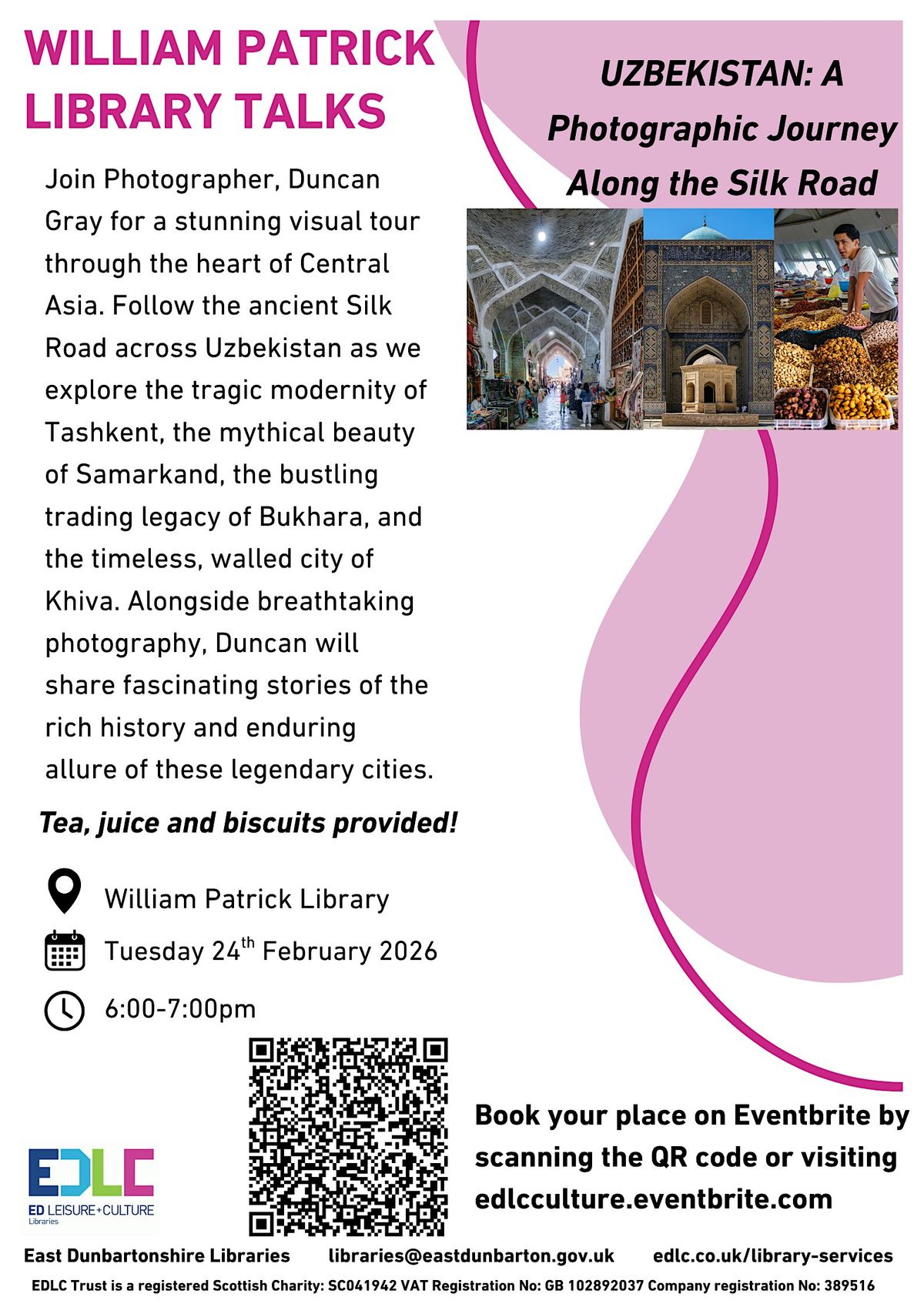 Follow the ancient Silk Road across Uzbekistan as we explore the tragic modernity of Tashkent, the mythical beauty of Samarkand, the bustling trading legacy of Bukhara, and the timeless, walled city of Khiva. Alongside breathtaking photography, Duncan will share fascinating stories of the rich history and enduring allure of these legendary cities.