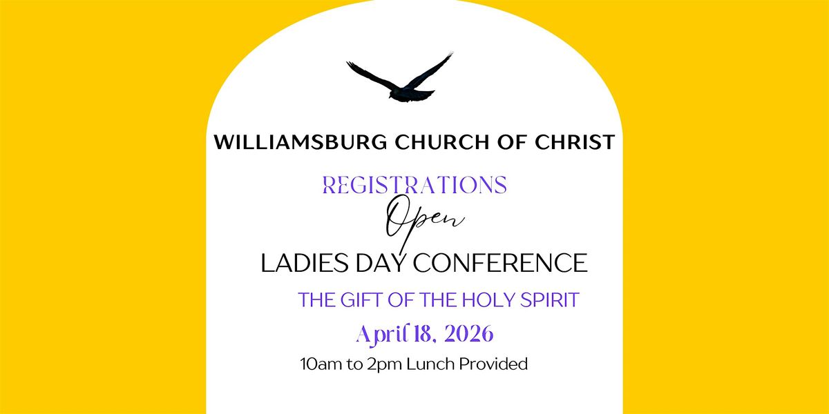Hey Ladies! Join us at WCOC on Saturday April 18, 2026 at 10AM-2PM. Our topic this year is, "The Gift of the Holy Spirit. Get ready for a day filled with engaging speakers, spiritual growth, and more! Don't miss this opportunity to connect and share in God's word at Williamsburg Church of Christ Ladies Day Conference. Reserve your seat in advance!