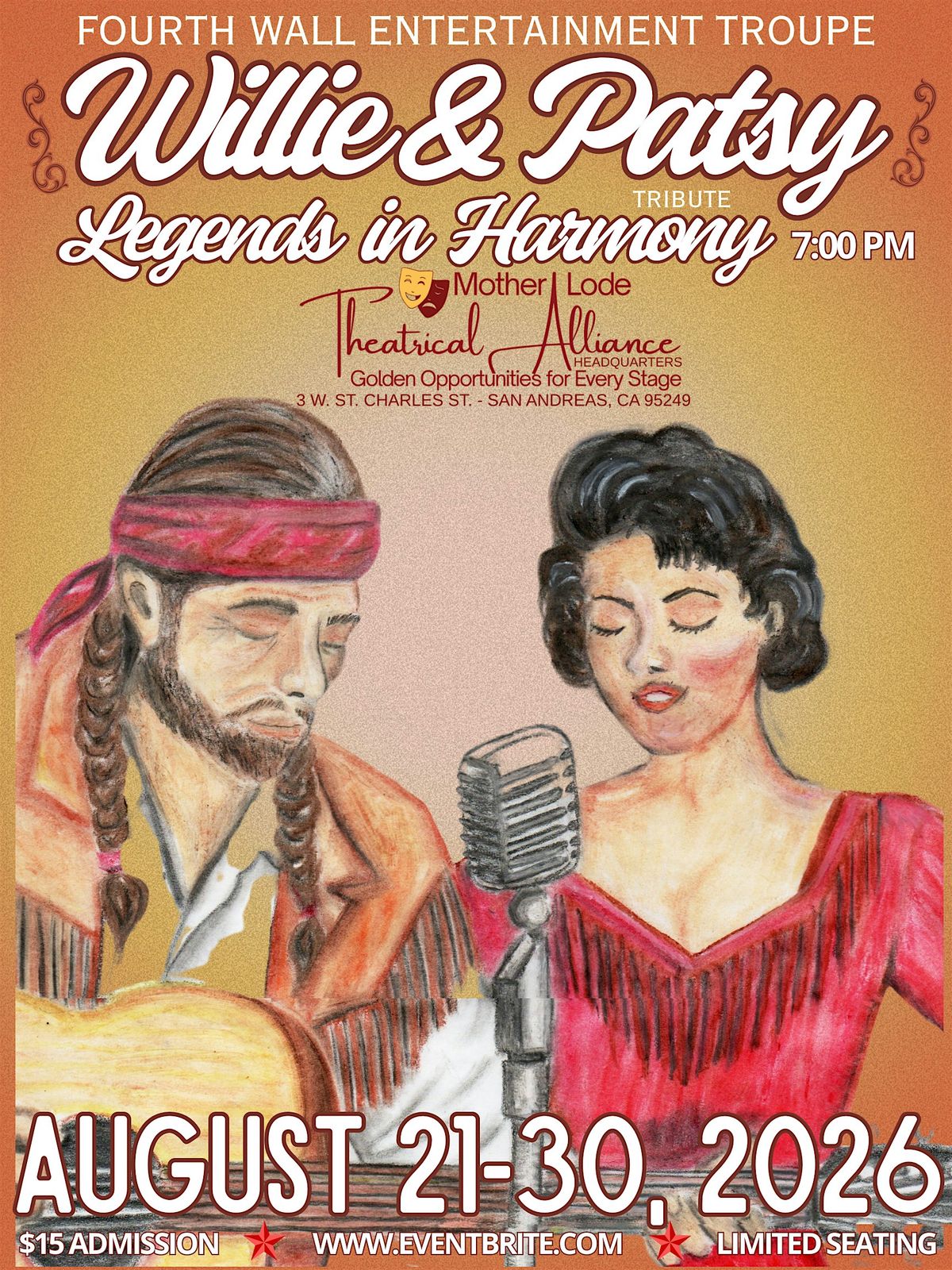 Join us for a live tribute to Willie Nelson and Patsy Cline at the newly renovated Mother Lode Theatrical Alliance Headquarters!About this Event
