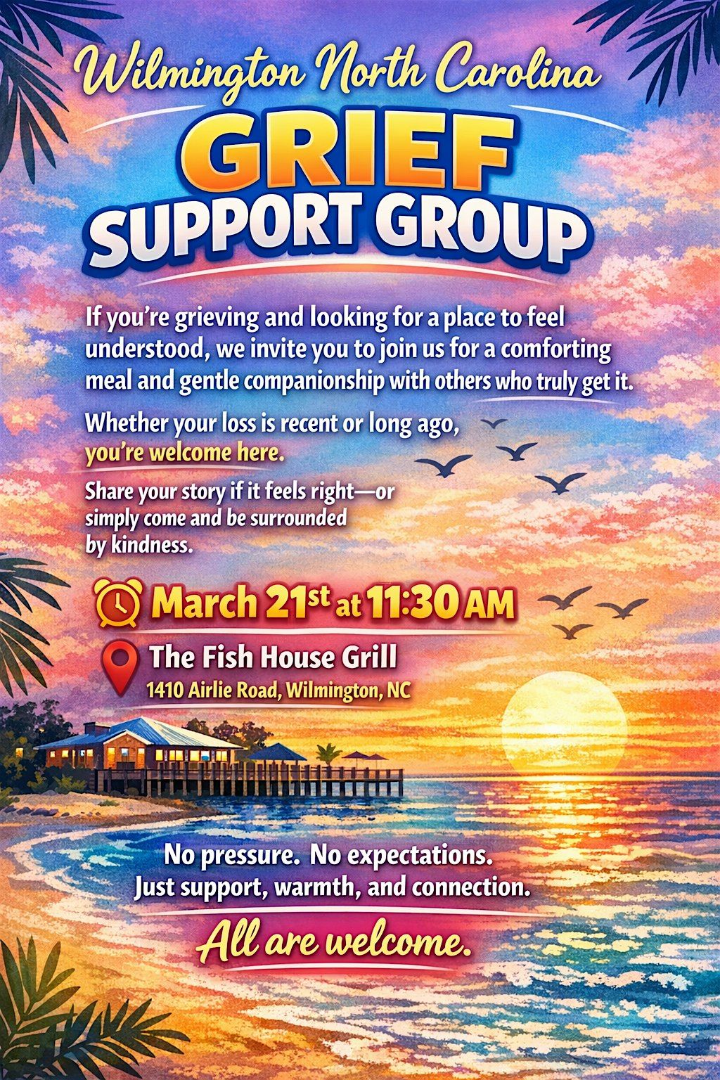Join us in person for an in person grief support meetup at the Fish house Grill