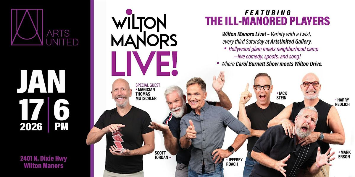 Step into the spotlight with Wilton Manors’ newest variety show! Featuring The Ill-Manored Players: Mark Erson, Scott Jordan, Jeffrey Roach, and Jack Stein. Inspired by The Carol Burnett Show, we bring you a night of sketch comedy, music, spoofs, and audience fun—served up with plenty of local flair. Every third Saturday at Arts United Gallery, join us for an evening where the laughter is live, the talent is local, and anything can happen.