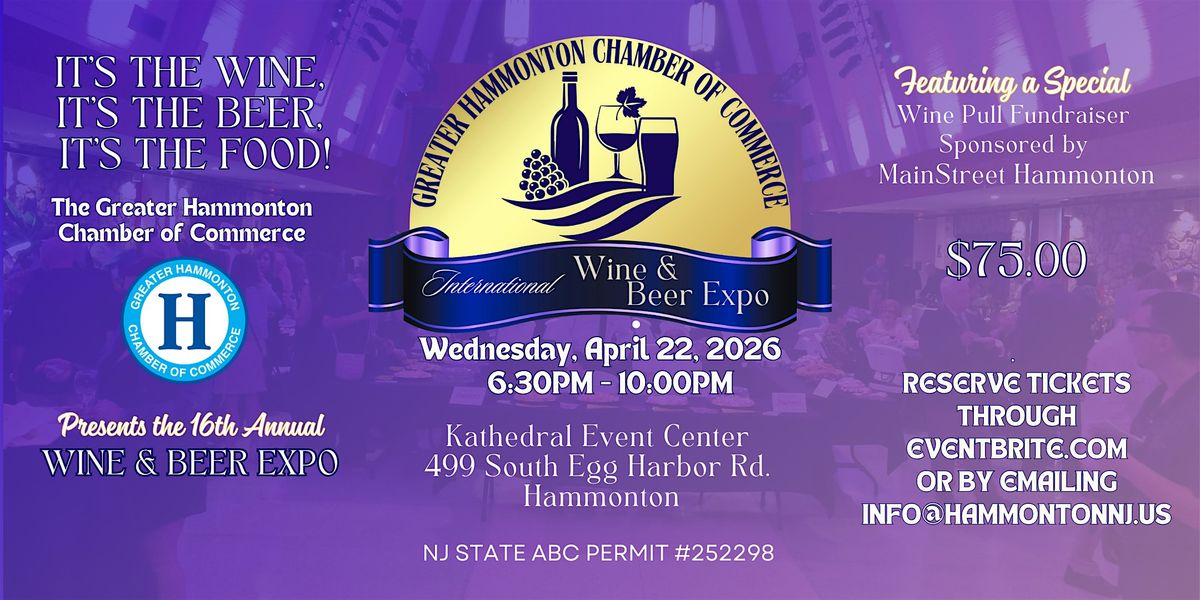 The Greater Hammonton Chamber of Commerce has announced that it will present its 16th Annual International Wine & Beer Expo on Wednesday April 22, 2026, at Kathedral Event Center in Hammonton.