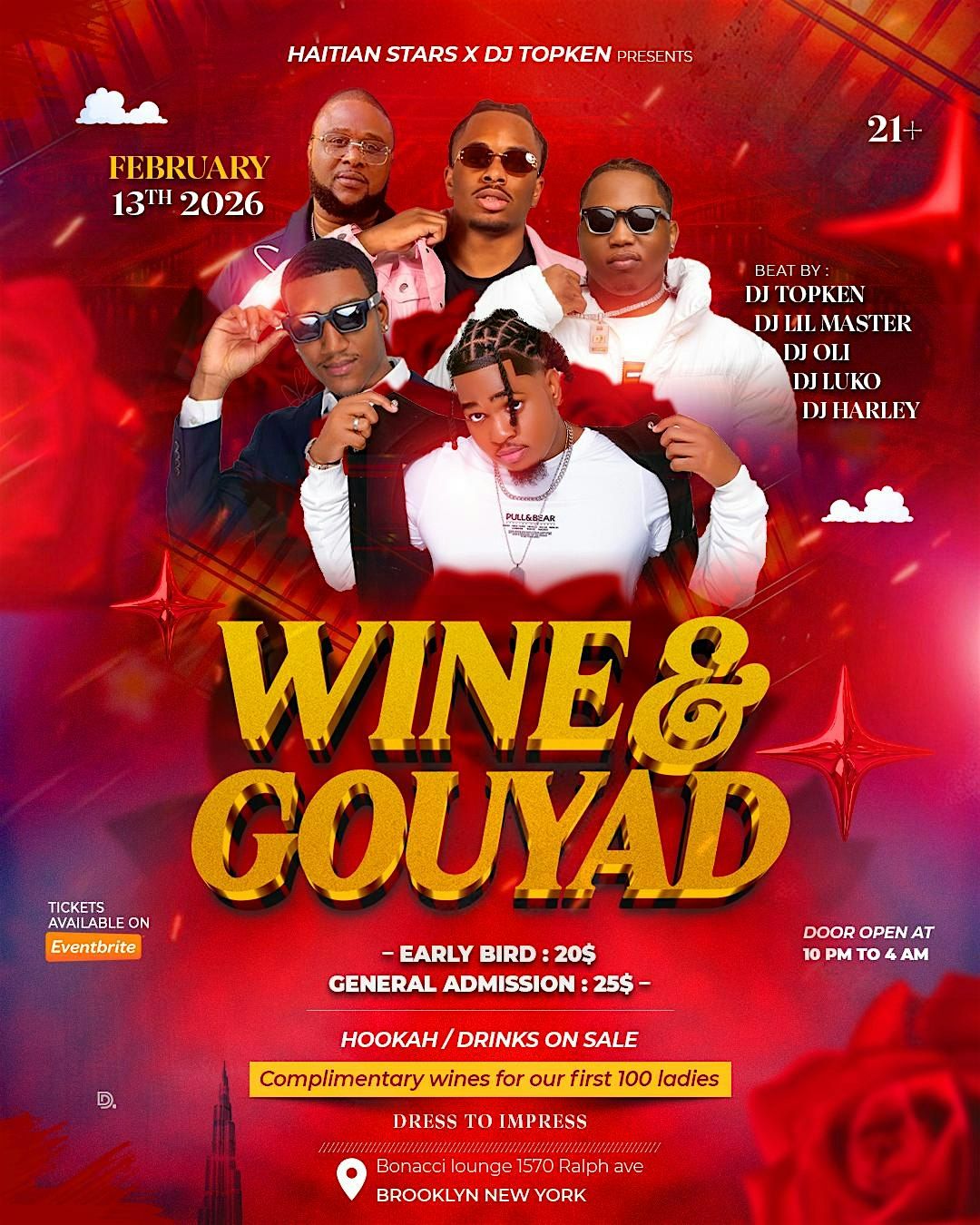 Ready for an unforgettable night? Come vibe with us in person at Wine & Gouyad — a fun gathering where great wine meets awesome grooves. Whether you're a wine lover or a dance enthusiast, this event is all about good times, delicious sips, and smooth moves. Don’t miss out on the chill atmosphere and friendly crowd. Bring your friends, bring your energy, and let’s make some memories!