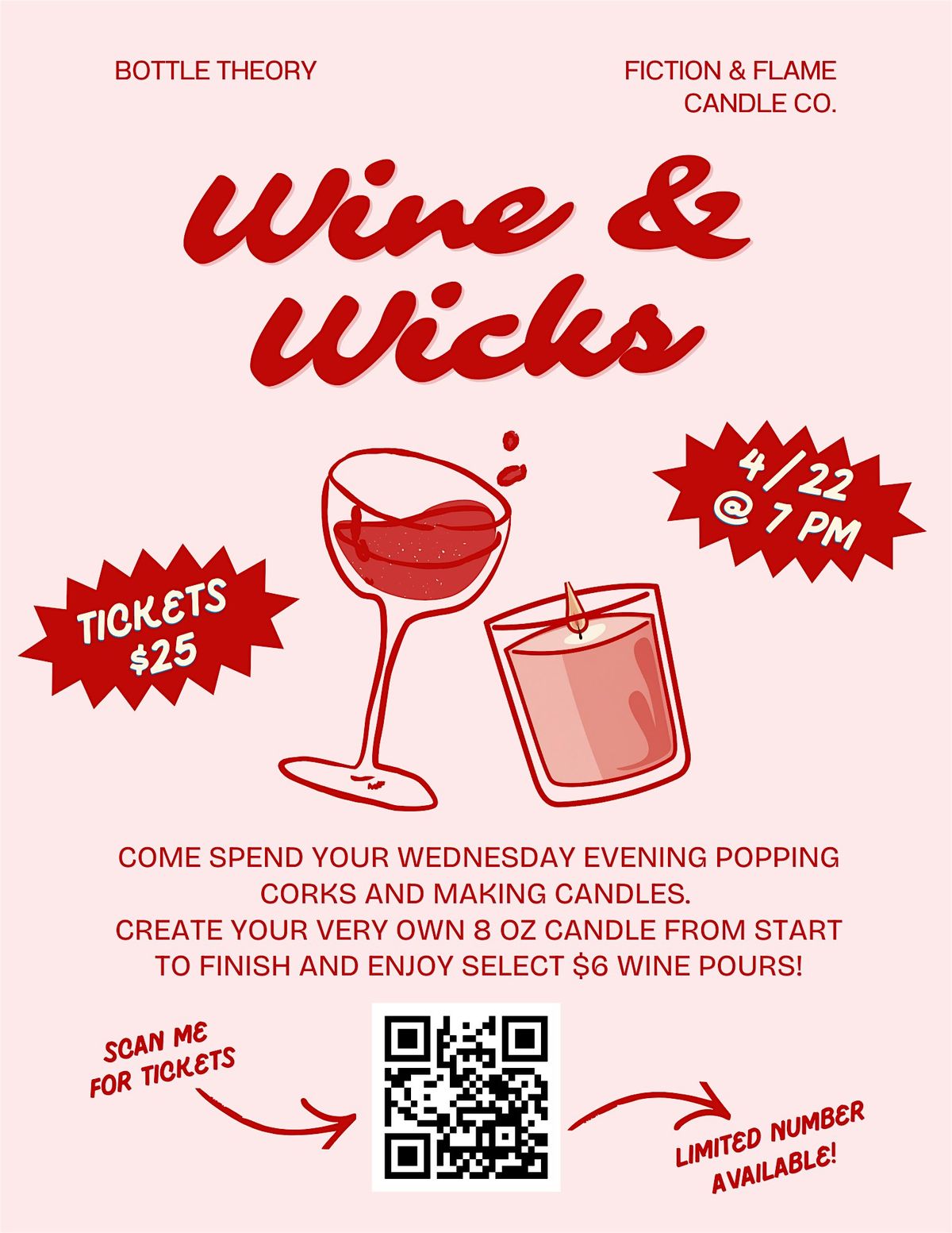 Come spend your Wednesday night popping corks and making candles! Join Meg from Fiction & Flame Candle Company and make your very own 8 oz candle from start to finish. Bottle Theory will be offering select $6 wine pours as well!​Grab your friends, get creative, and enjoy a fun low key night out