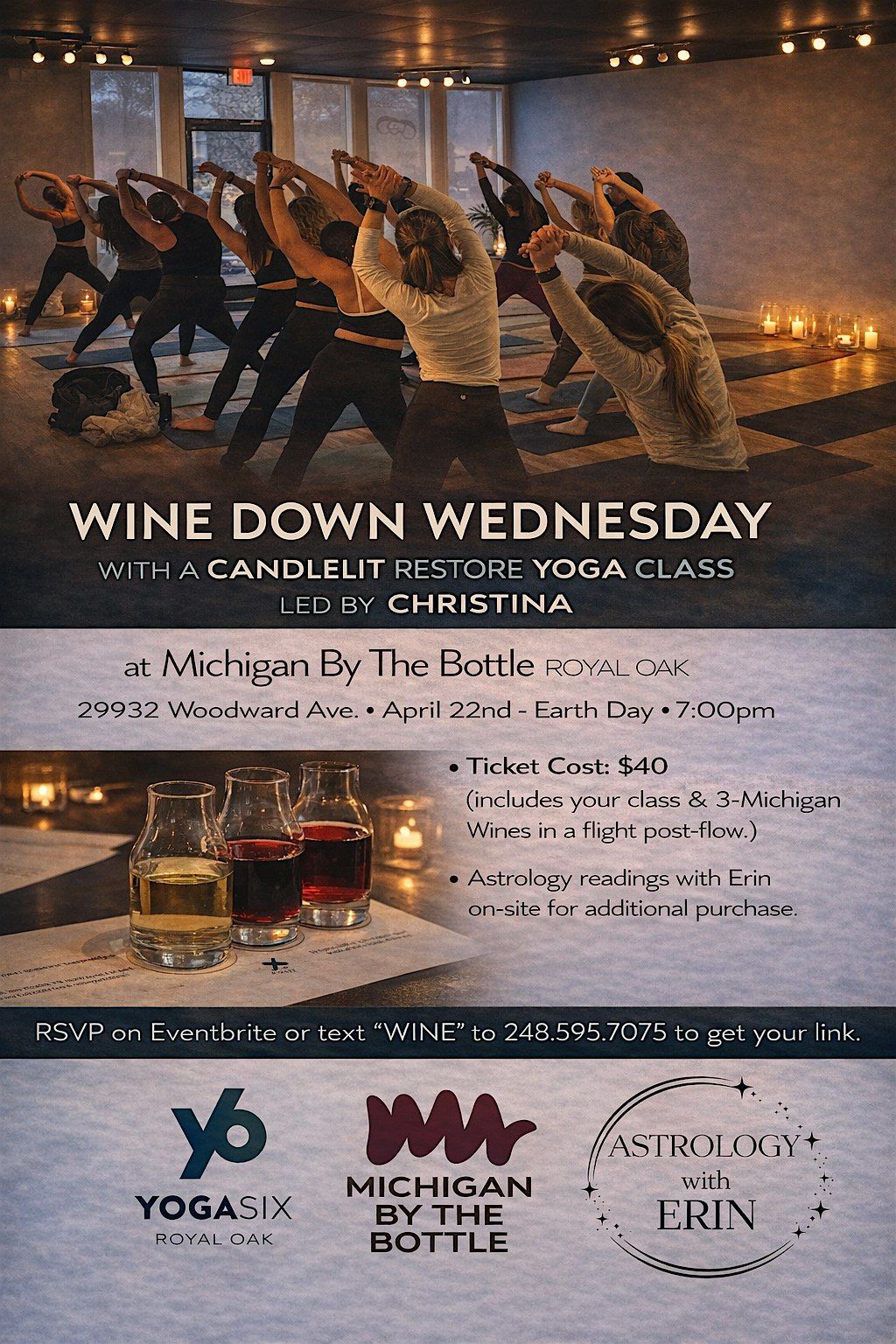 We’ll begin with a candlelit Restore class at 7PM—grounding, gentle, and inspired by the spirit of Earth Day. After class, stay and sip as you enjoy a curated flight of three Michigan wines in a cozy, welcoming atmosphere.