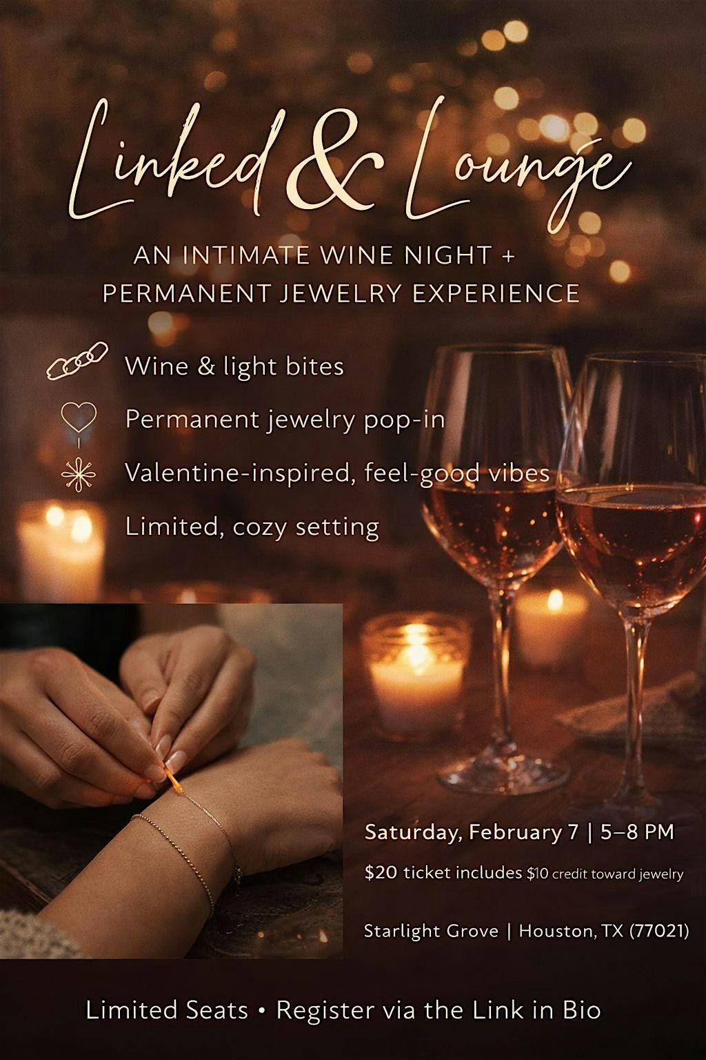 Linked & Lounge is a spin on galentines! An intimate wine night hosted at Starlight Grove, designed for women who enjoy cozy vibes, meaningful connection, and beautiful experiences.