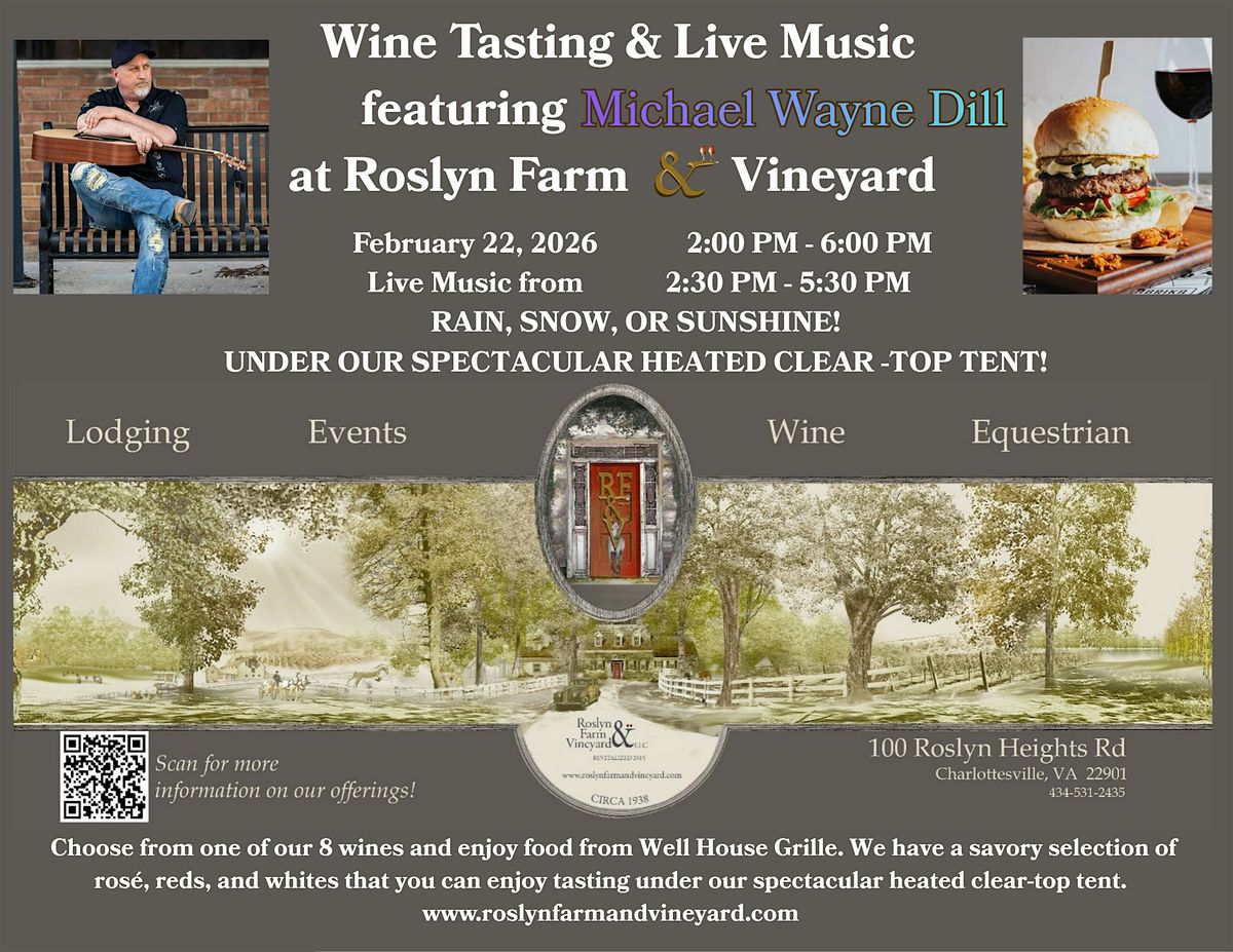 Come join us in person for a fantastic day at Roslyn Farm & Vineyard featuring Michael Wayne Dill! Sip on some amazing wines while enjoying live music in a beautiful, relaxed setting. Perfect for wine lovers and music fans alike — bring your friends and make it a fun outing!