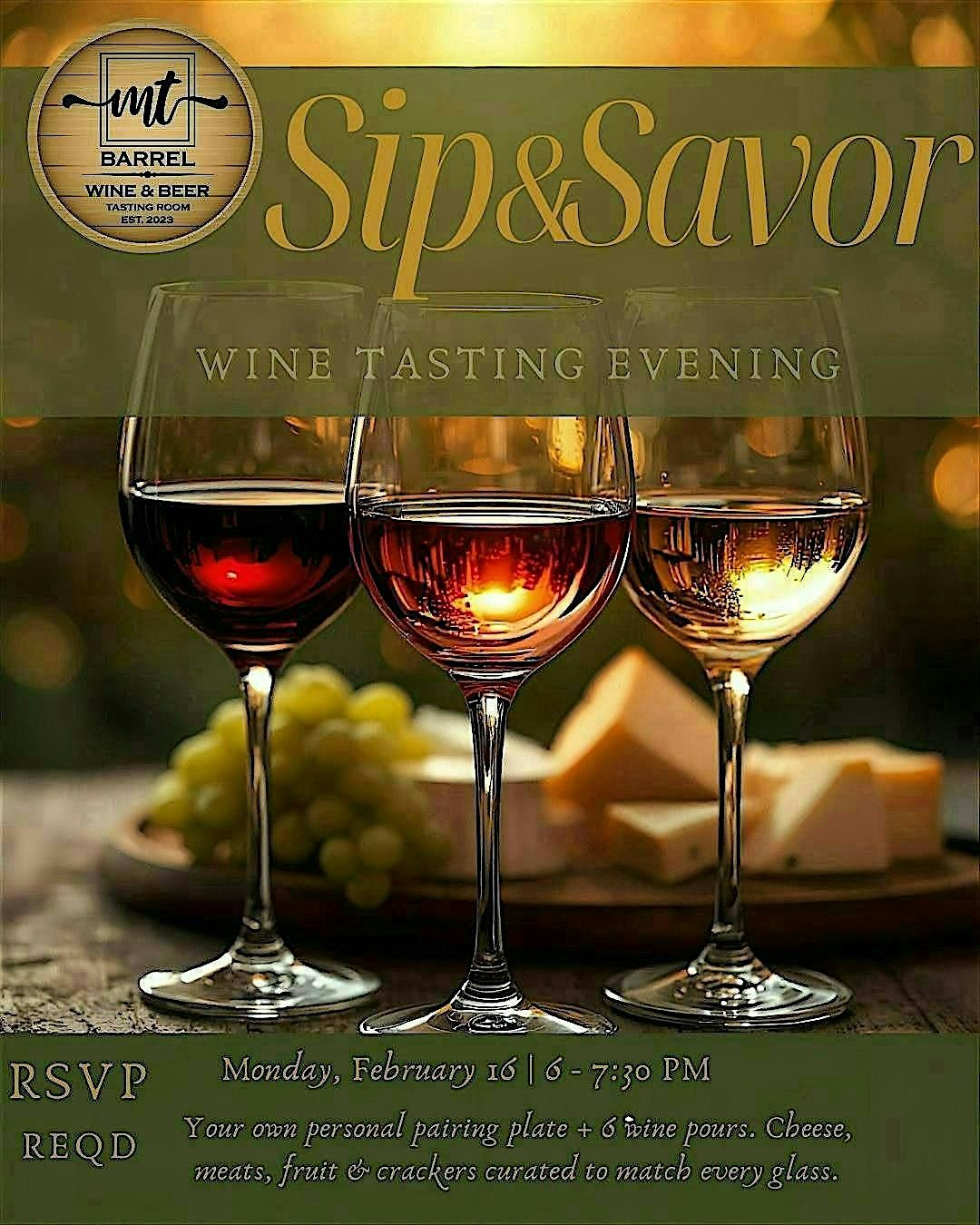 Join us for an intimate wine‑tasting evening featuring six curated wines. Enjoy a customized charcuterie board thoughtfully crafted to pair with each wine and finished with a special dessert. It’s the perfect low‑key, cozy way to ease into the week and savor something memorable.