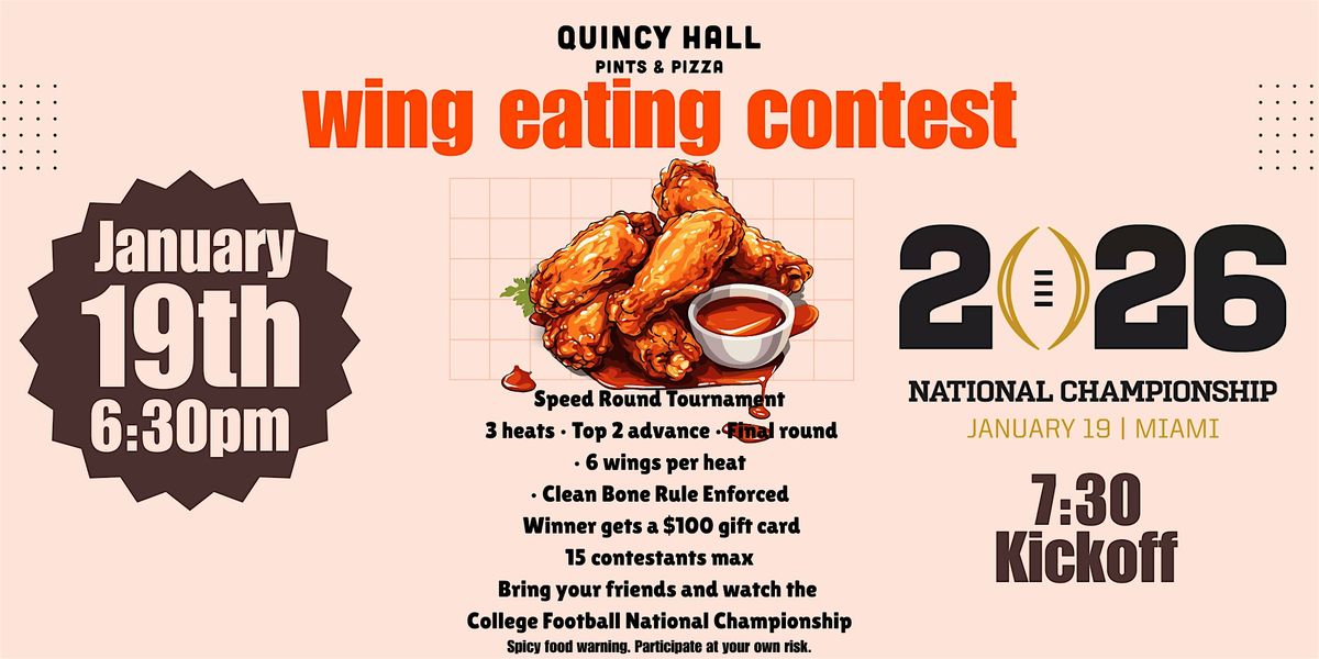 Jan 19 • 6:30pm Wing Eating Contest! Speed-round tournament, 3 heats, top 2 advance. $100 prize. CFP title game after.