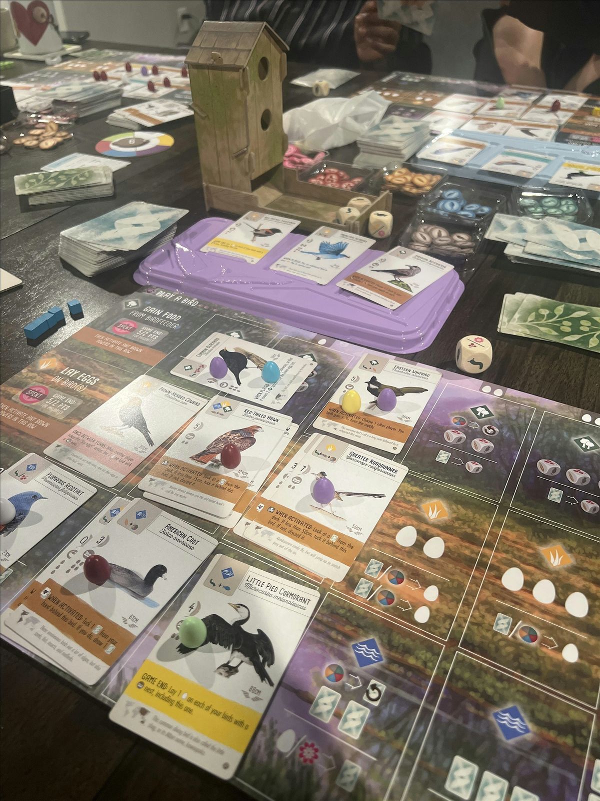 - Gain food tokens via custom dice in a birdfeeder dice tower