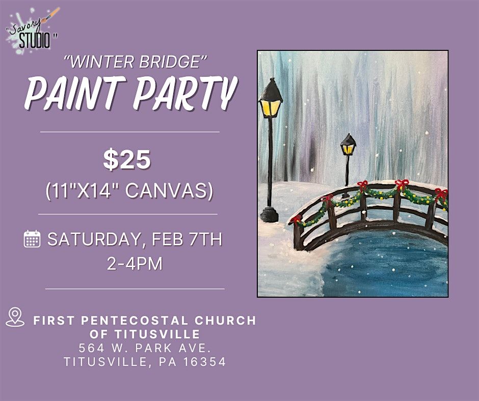 Welcome to the Winter Bridge Painting Party! Join us at 564 Park Ave on February 7, 2026 at 2:00 PM for a fun-filled event. Let's unleash our creativity and add some color to the winter scenery.