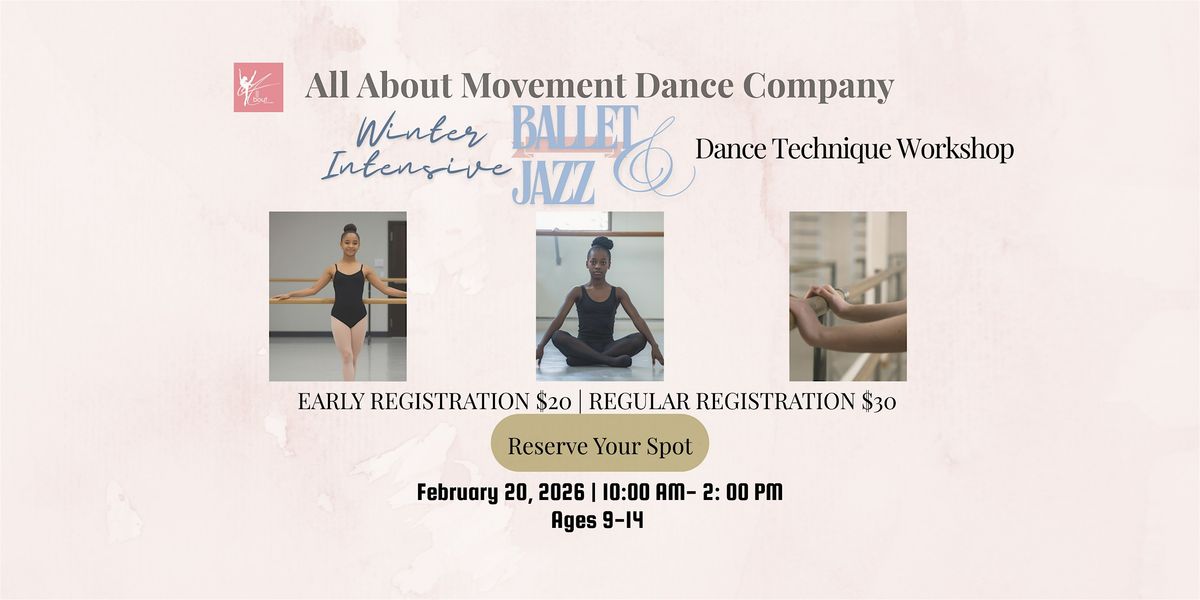 All About Movement Dance Company’s Winter Ballet & Jazz Dance Technique Intensive is a focused training experience designed to support and develop dancers ages 9–14 through structured, high-quality instruction. This intensive emphasizes strong technical foundations, musicality, alignment, and performance confidence within a professional and encouraging environment.
