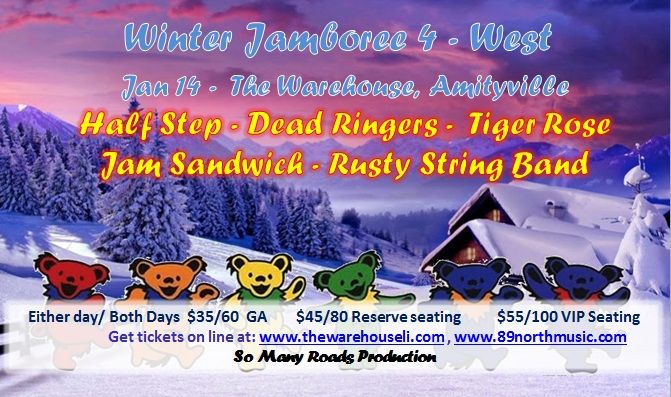 Winter Jamboree 4 West, five great bands, one great day!Half Step, Ringers, Tiger Rose, Jam Sandwich and Rusty String Band playing lots of Grateful Dead, JGB and other jammy music.