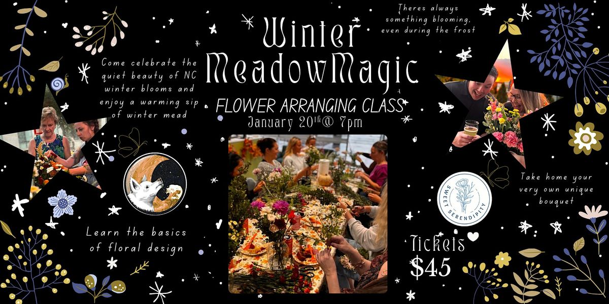 Grab a friend and learn the basics of floral design with local NC blooms at Moon Dog Meadery! This class will have unique flowers, lush greenery, and fun wintery add-ons. Guided instruction will teach you all the tips and tricks you need to make a beautiful arrangement to bring home with you.